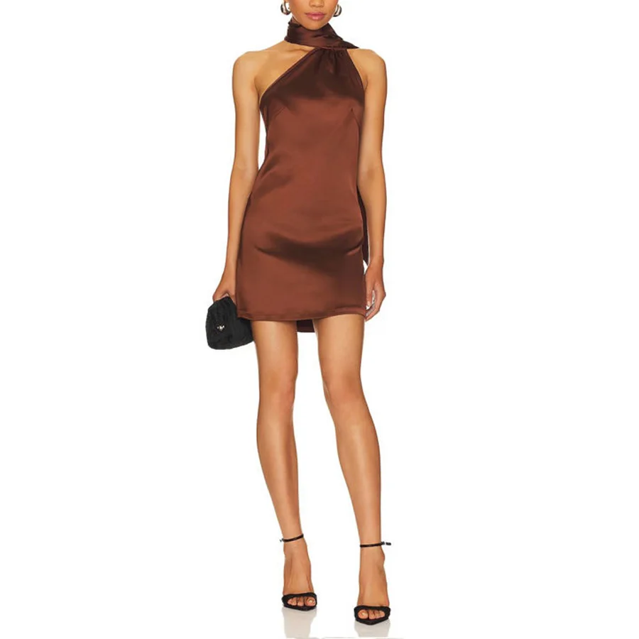 OEM Sleeveless Mock Neck Casual Summer Woven Satin Mini Dress Daily Washable Women's Elegant