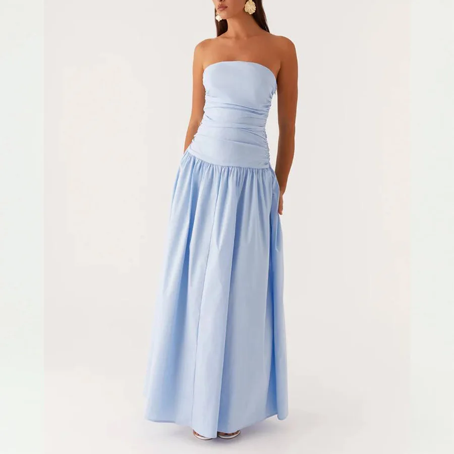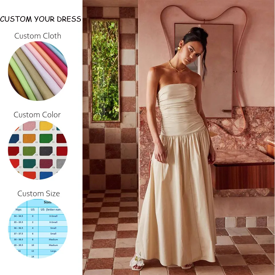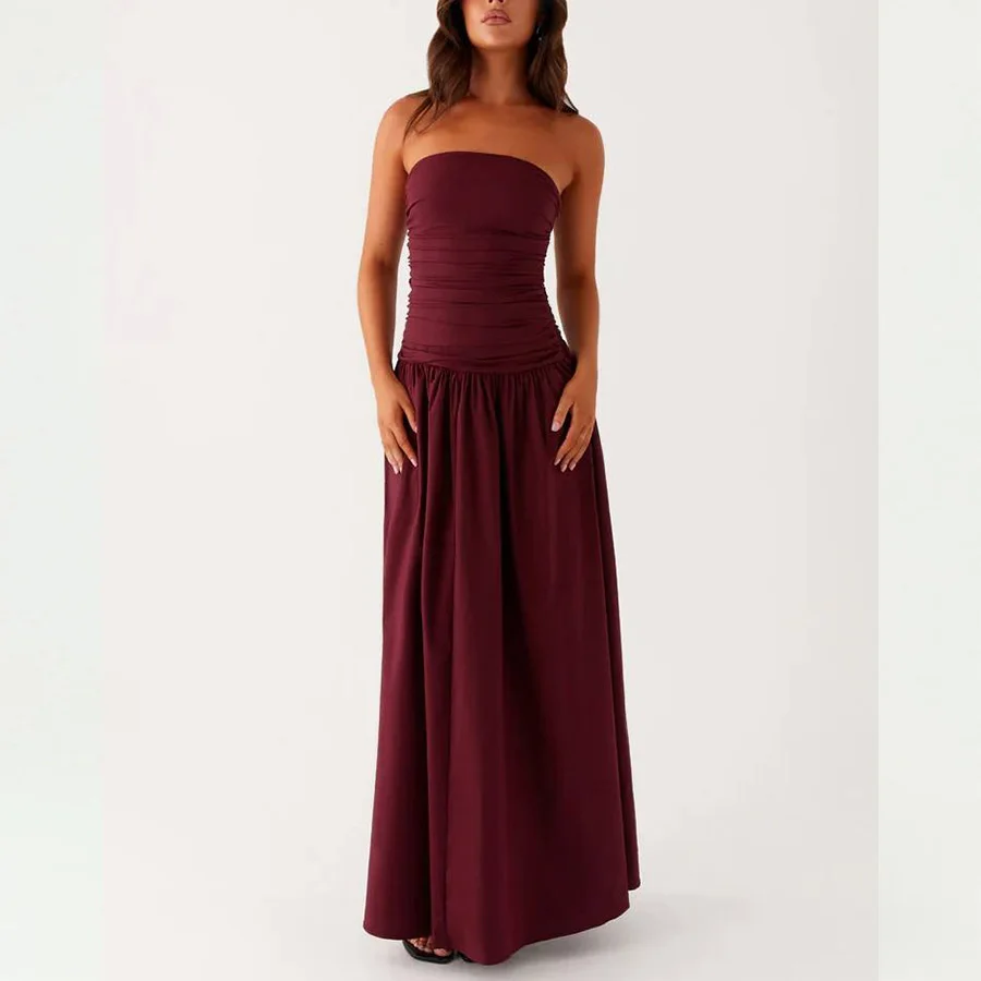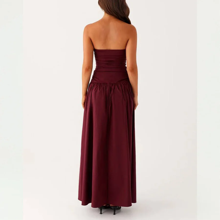 Custom New Arrival Female Strapless Neckline Waist Burgundy Maxi Casual Summer 100% Cotton Solid Plain Dyed Front Evening Dress
