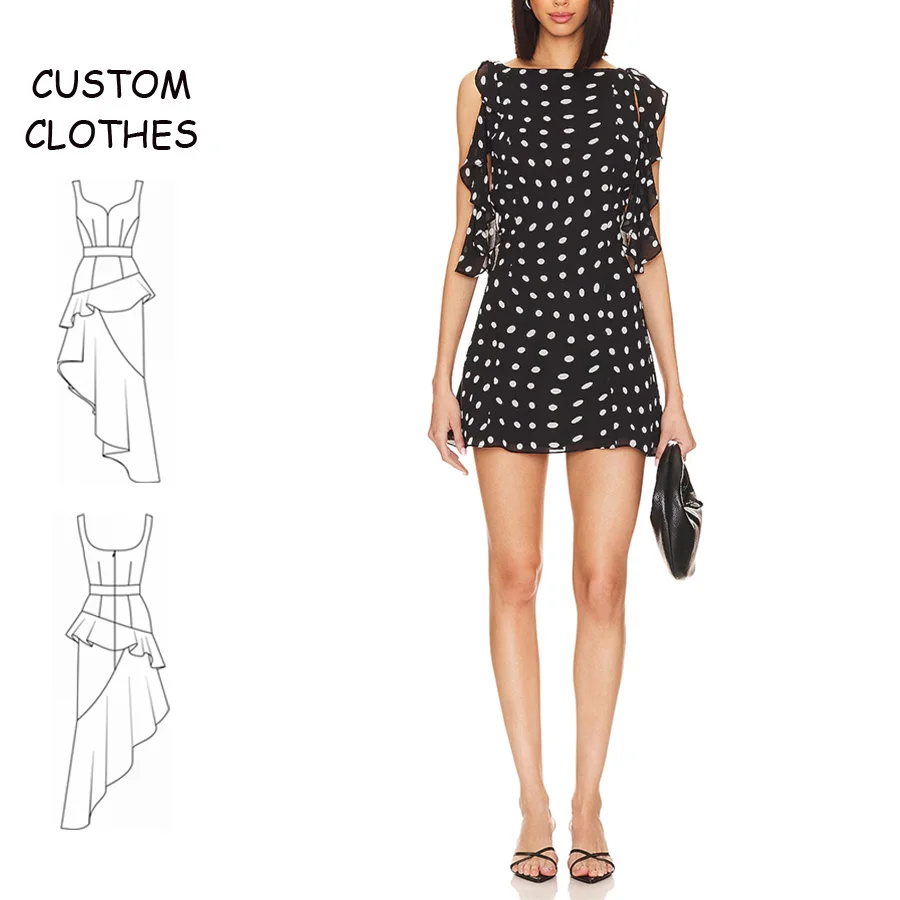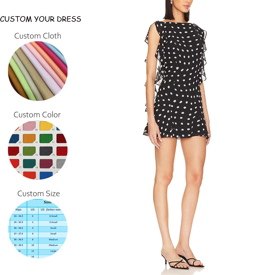 Custom Woven Plain Dyed Spring Summer Autumn Ruffled Sleeveless Neck Morden Polka Dots Backless Mini Women's Dress