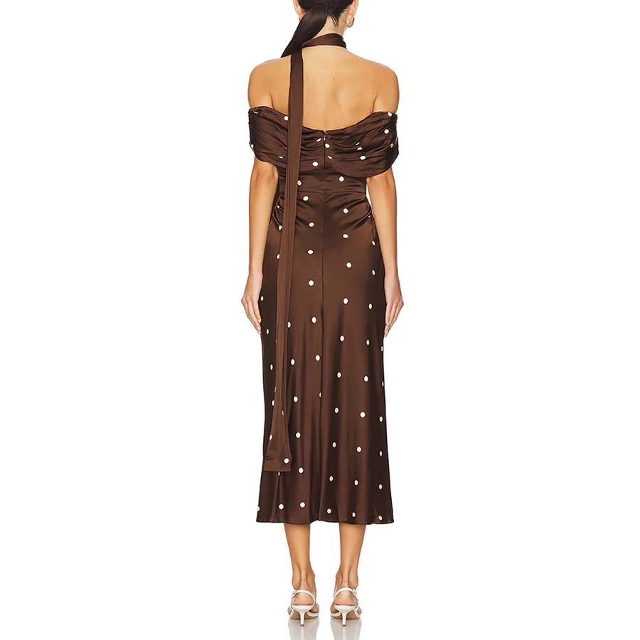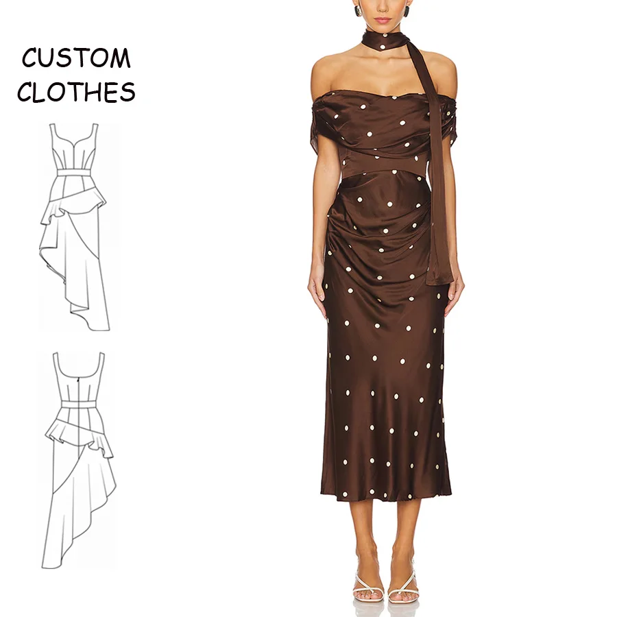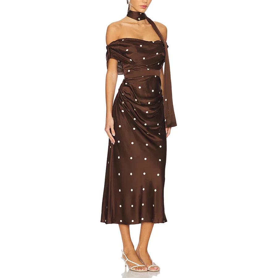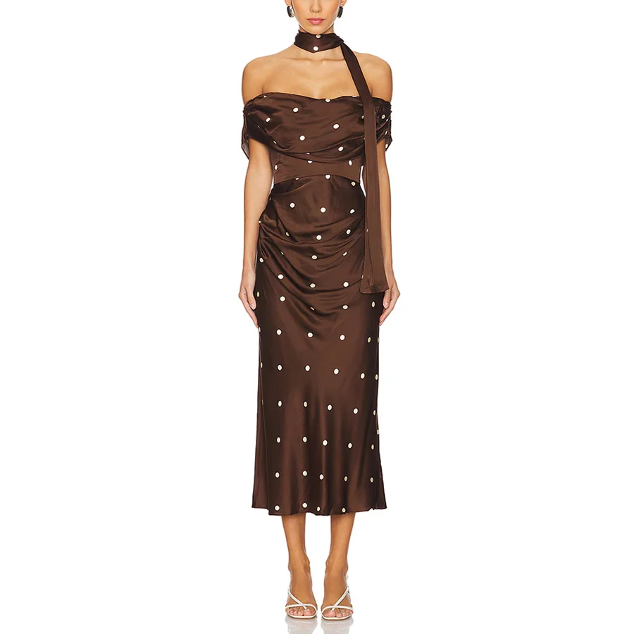 ZYHT 73963 Matte Satin Printed Geometric Pattern Maxi Women Asymmetric One Shoulder Ruched Hem Women Dress