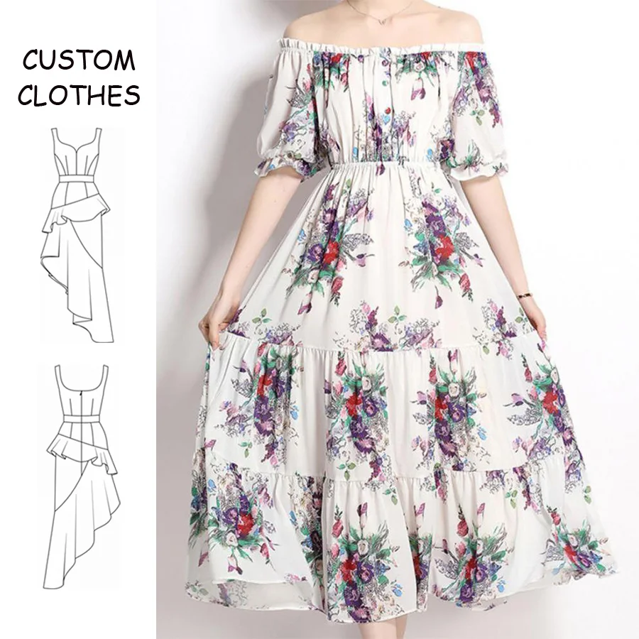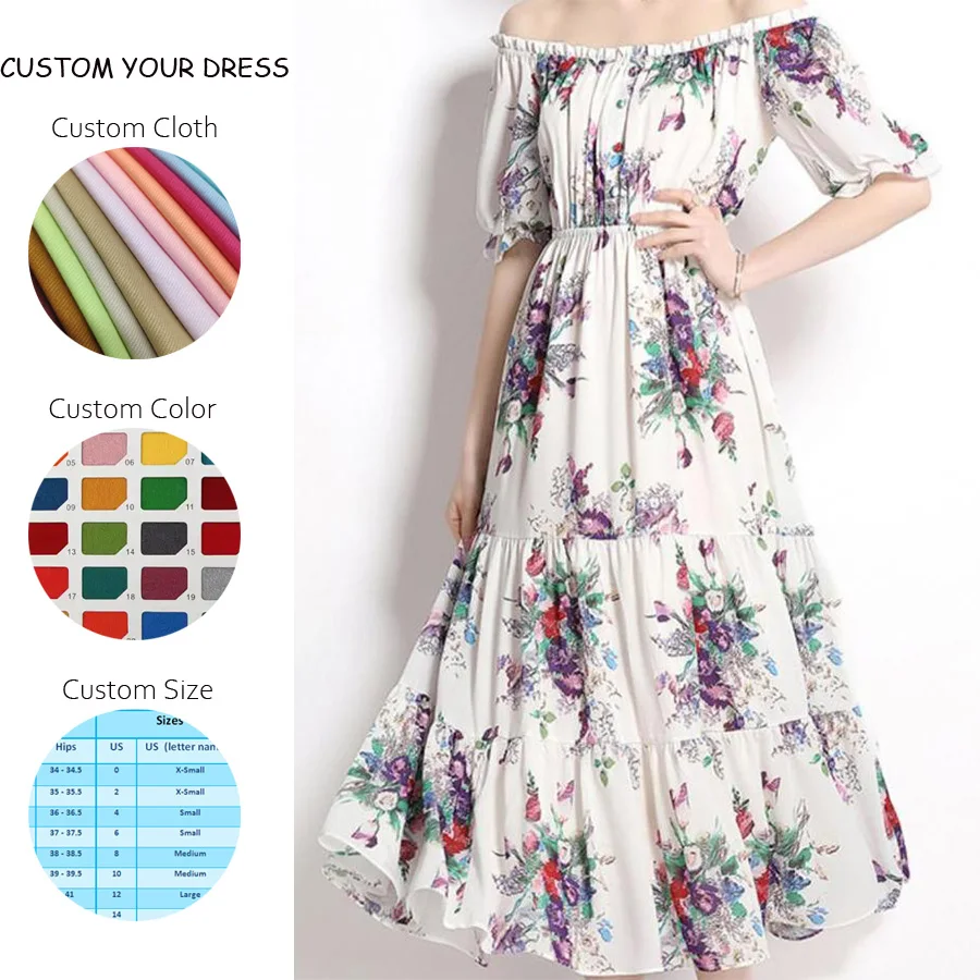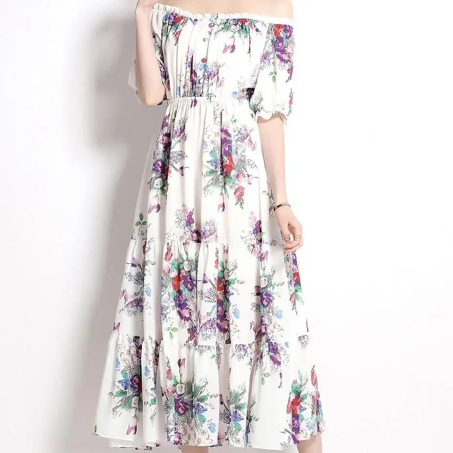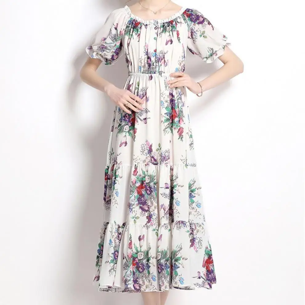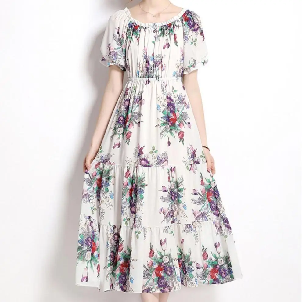 OEM Wholesale Pure Polyester Ladies Casual Floral Print Chiffon A-Line Maxi Dress Empire High Waisted Crew Neck Short Washable