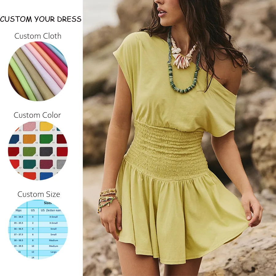 2025 OEM Women's Casual One-Shoulder Summer Dress Custom New Hot Sexy Solid Color A-Word Waist Front Logo Plain Dyed ODM Supply