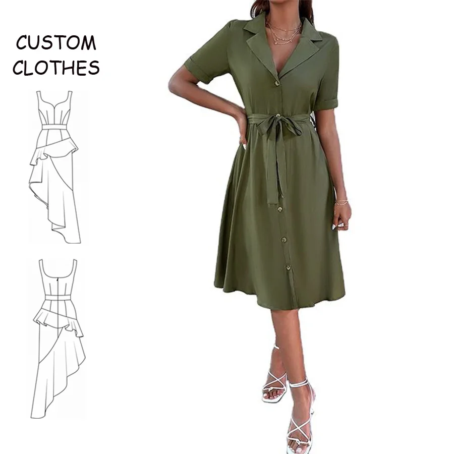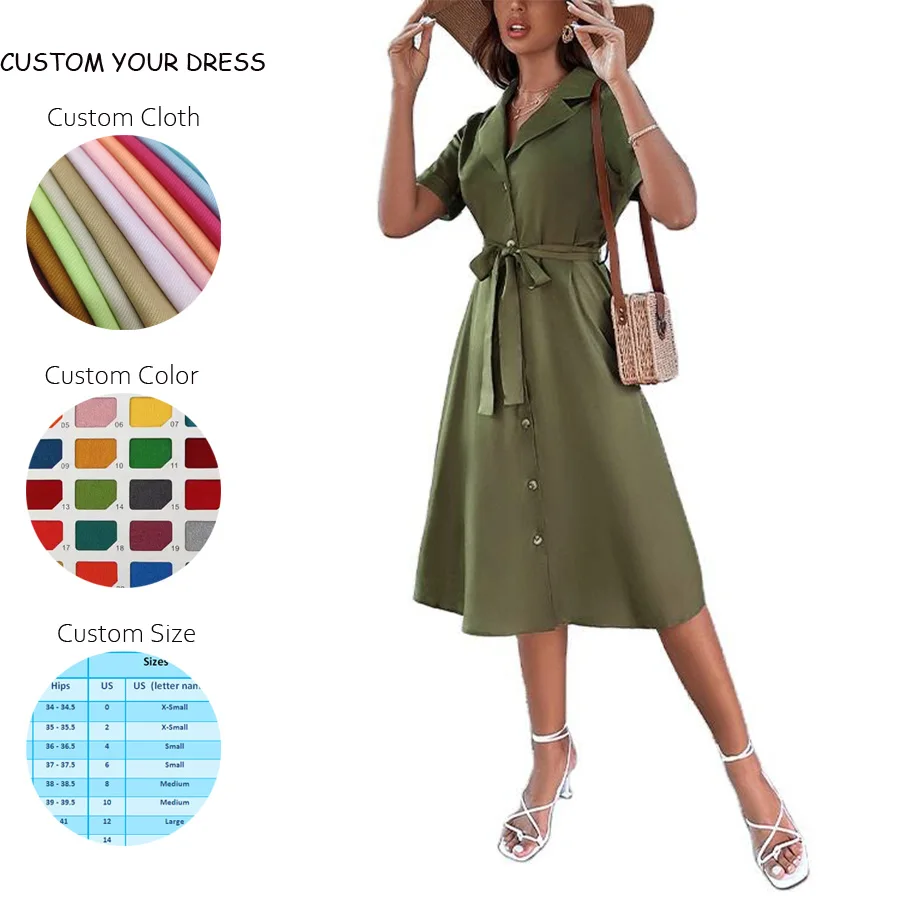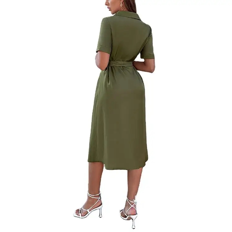 Fashion Wholesale Elegant Casual V-neck Short Sleeve Solid A-Line Midi Dress Custom Empire Waist Button Front Belted Shirt Women