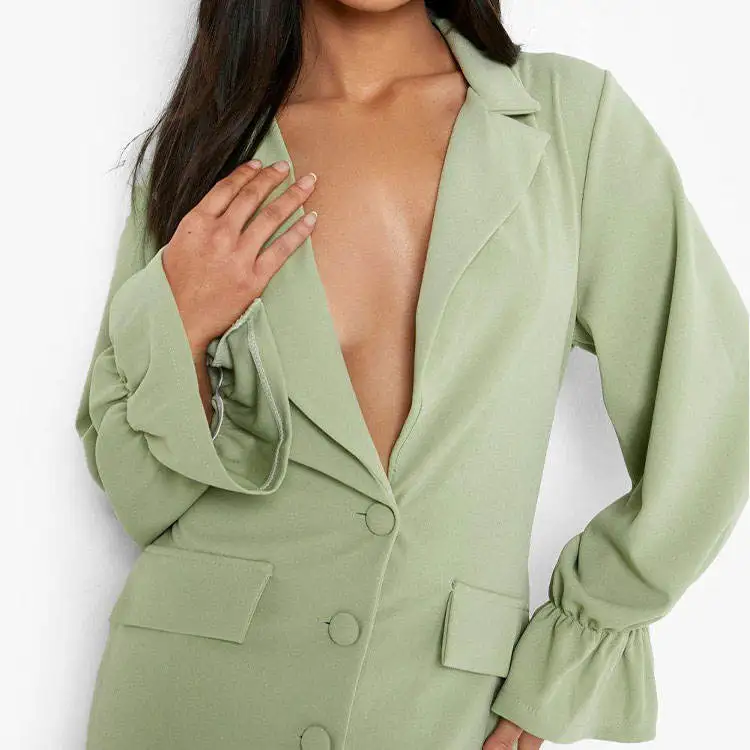 ZYHT 15545 Women's Blouses & Shirts Mint Green Tweed Blazer with Puff Sleeves & Peplum Fit Button-Detail Long Sleeve Jacket