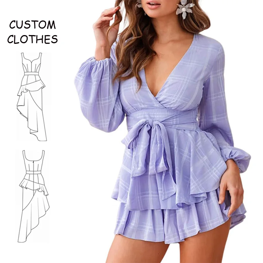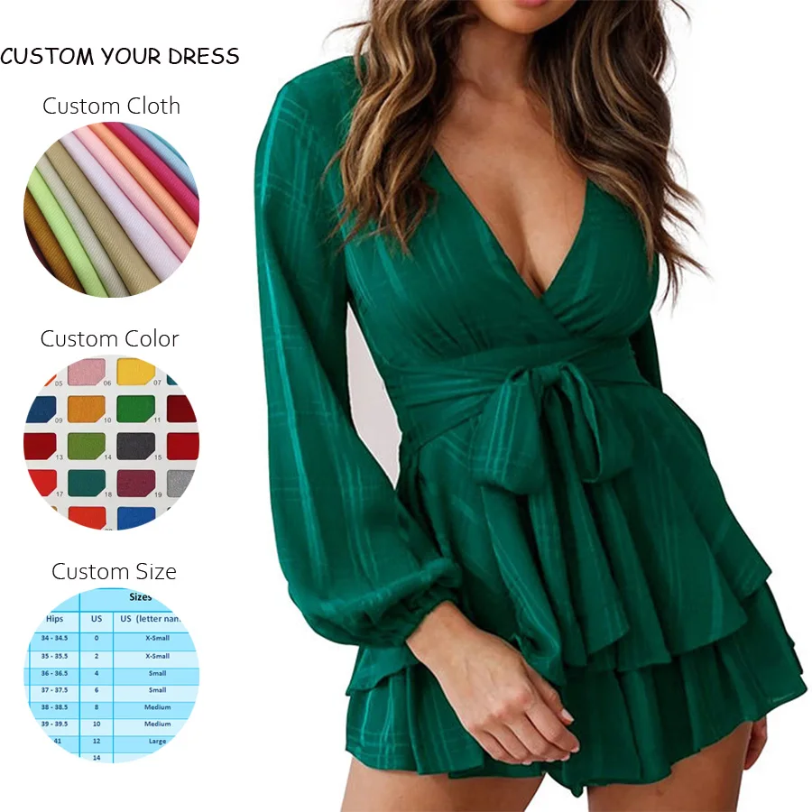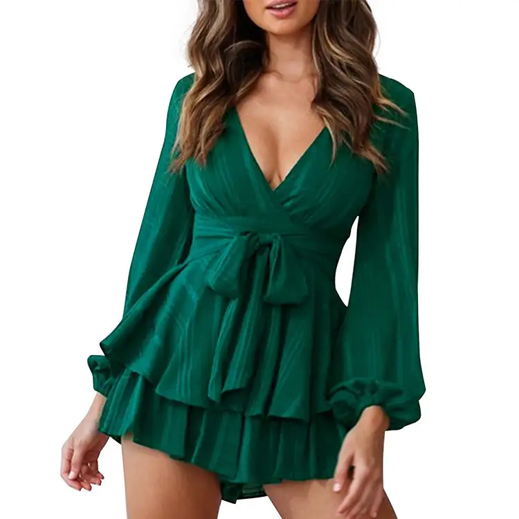 Fashion Woven Ruffle Solid V Neck Long Sleeve A-Line Casual Short Dress for Women