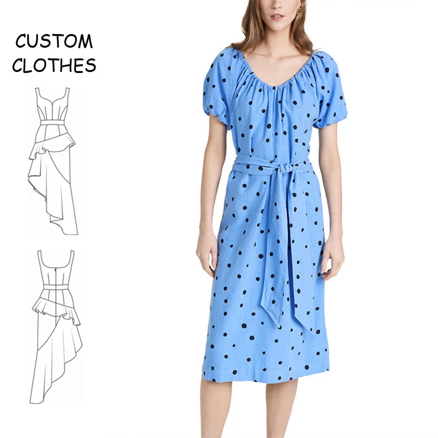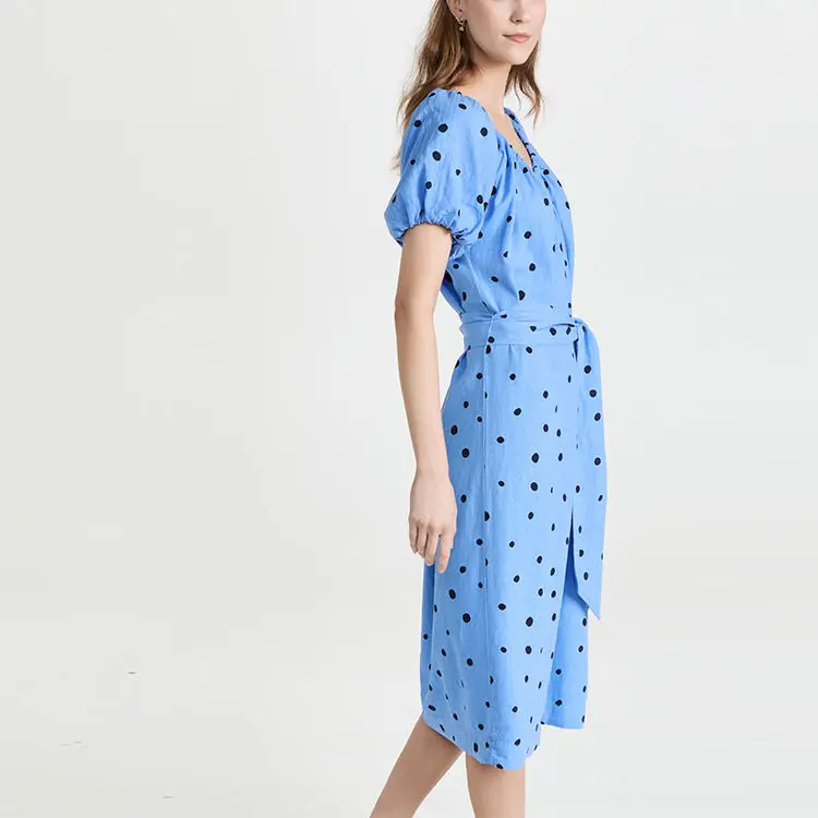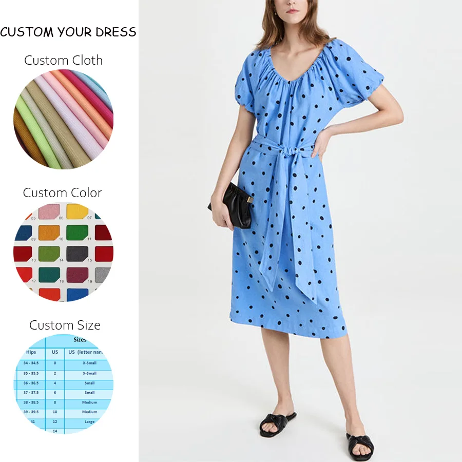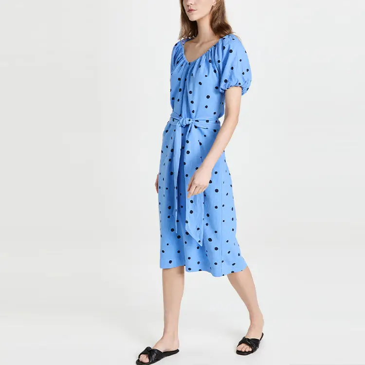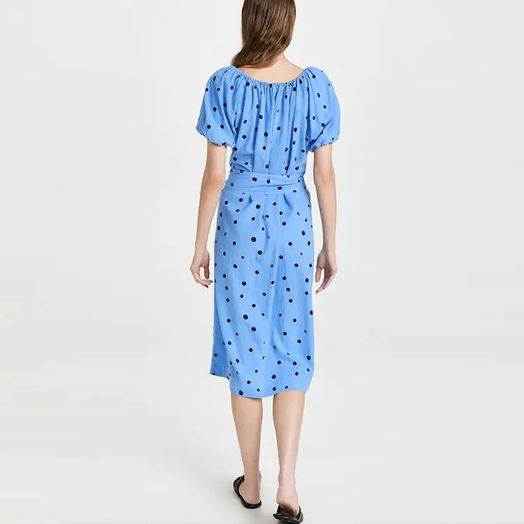 Ladies Slubbed Elastic Neckline off Shoulder Short Puff Sleeve Polka Dot Pattern Linen Belted Dot Dress Elegant for Women