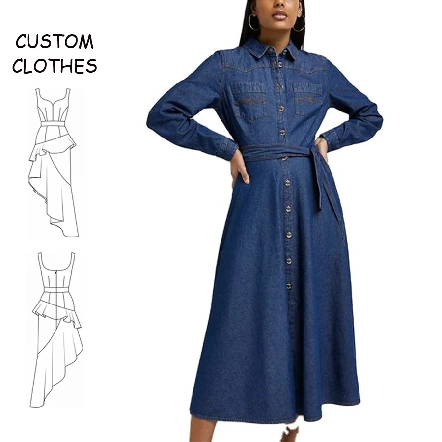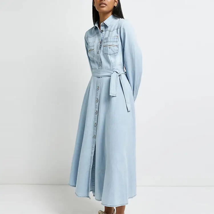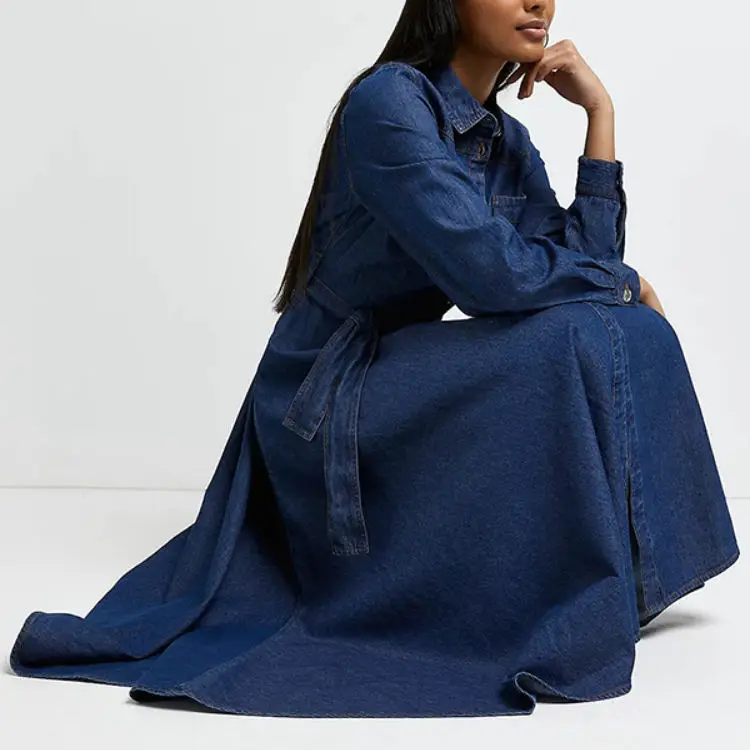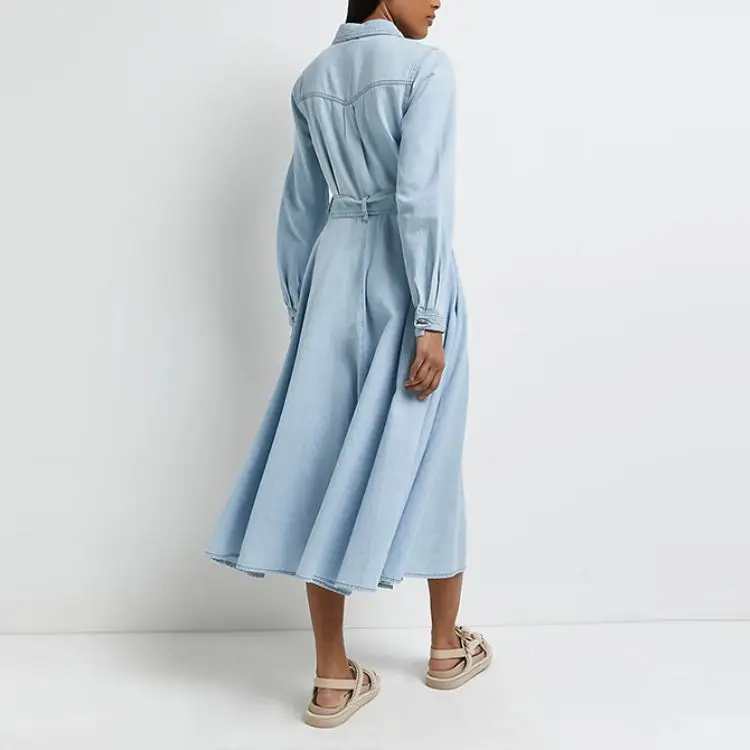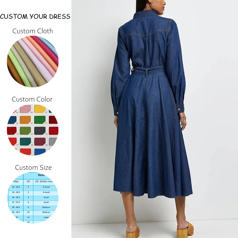 Fashion Wholesale Ladies Girls Midi Solid Denim Shirt Dress Elegant Customized Long Sleeve Casual A-Line
