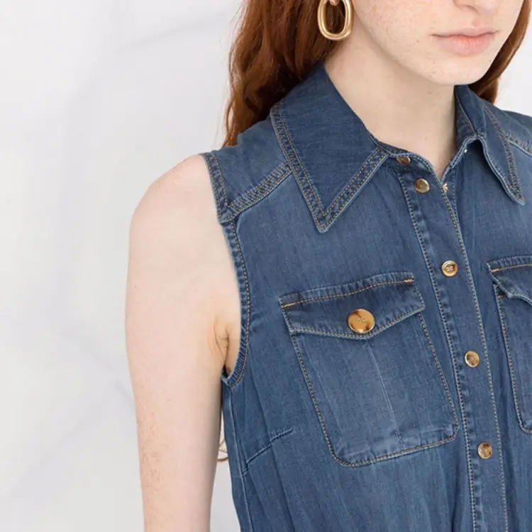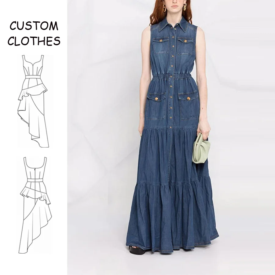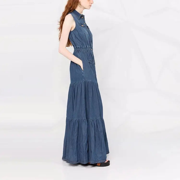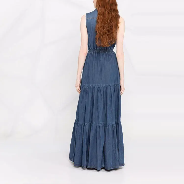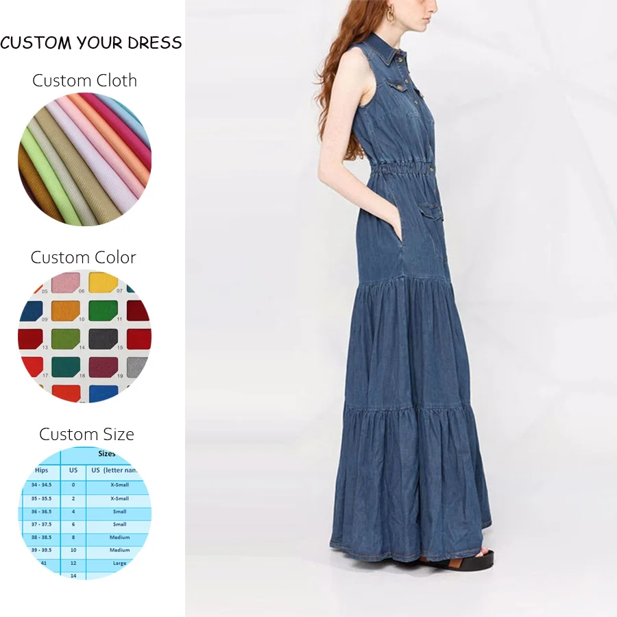 Fashion Wholesale Ladies Girls Maxi Denim Sleeveless Dress Elegant Customized Women Casual Ruffle Hem Digital Printing Washable