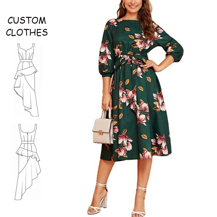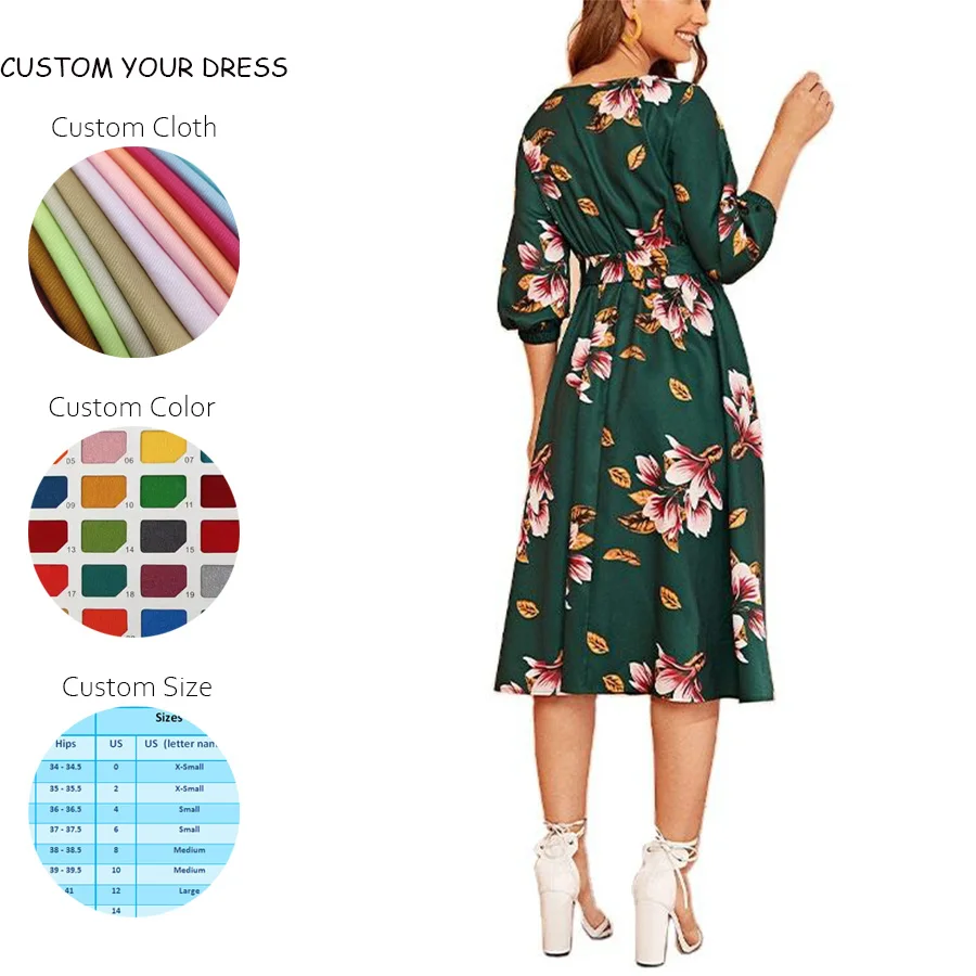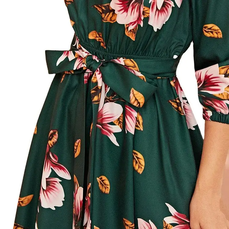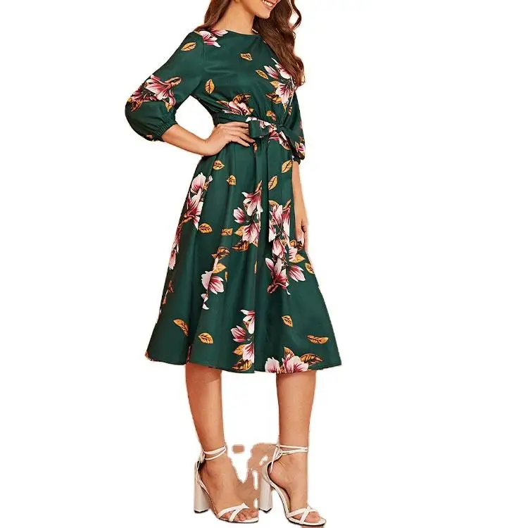 Wholesale Fashion Summer Half Sleeve Round Neck Ladies Midi Dresses Customized Floral Print Tie Detail Dress for Women