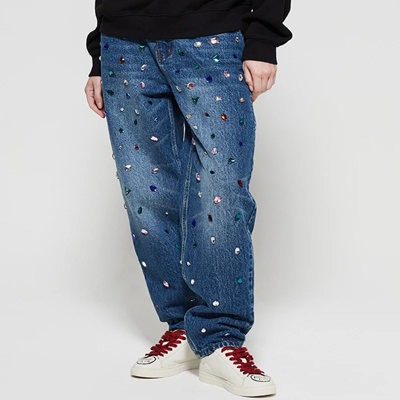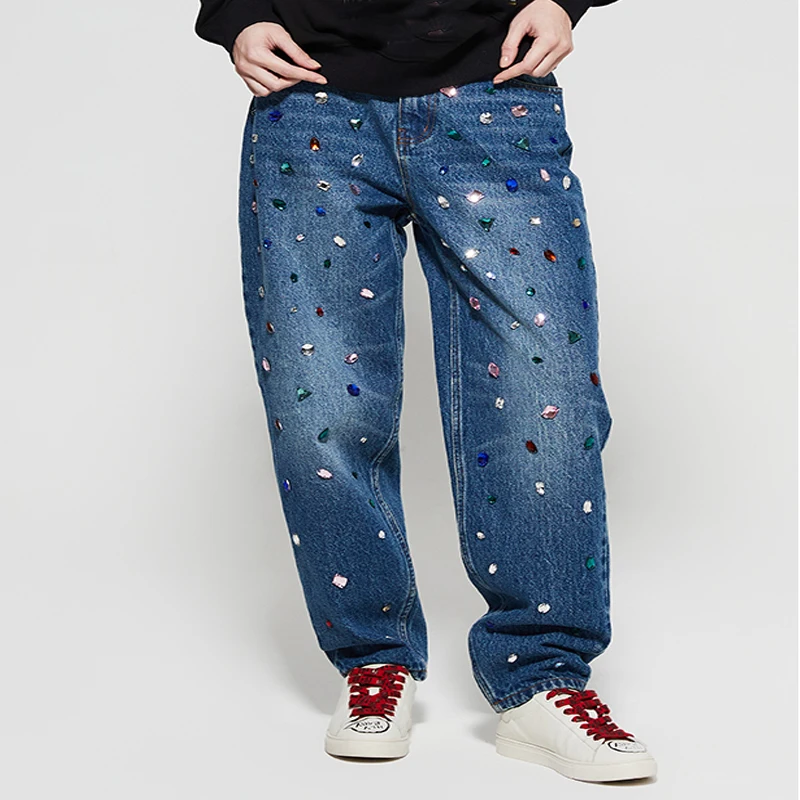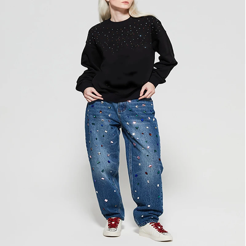 Wholesale Fashion Custom Design Women Mid Waist Breathable Baggy Boyfriend Rhinestone Jeans Plus Size Long Wide Leg Shiny Denim