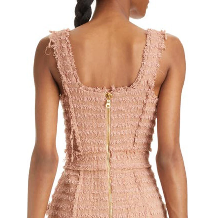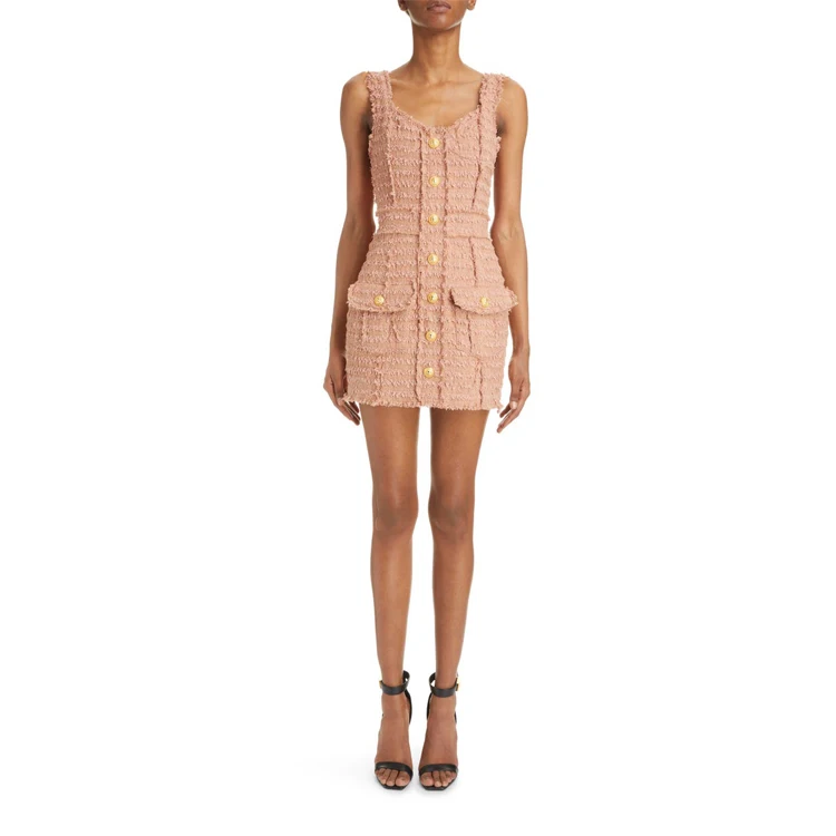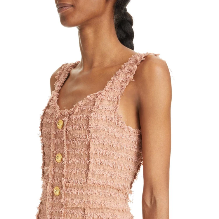 Custom Women's Gorgeous Work Pencil Dress Sleeveless Tassel Metallic Tweed A-Line Washable Button Simple Vintage Dress