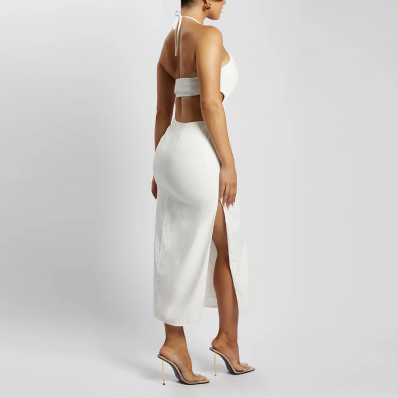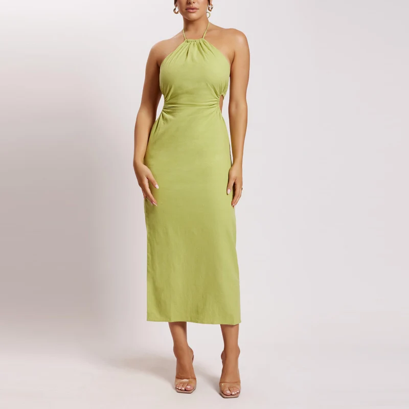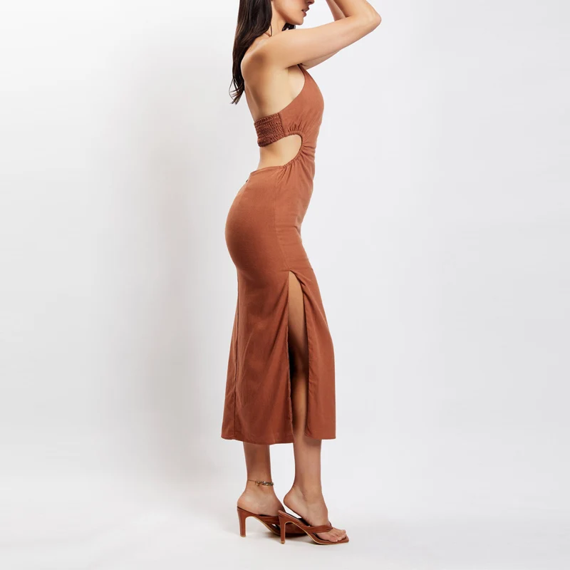Custom Women's Midi Dress with Halter Neck Side Split Woven Design Casual Style