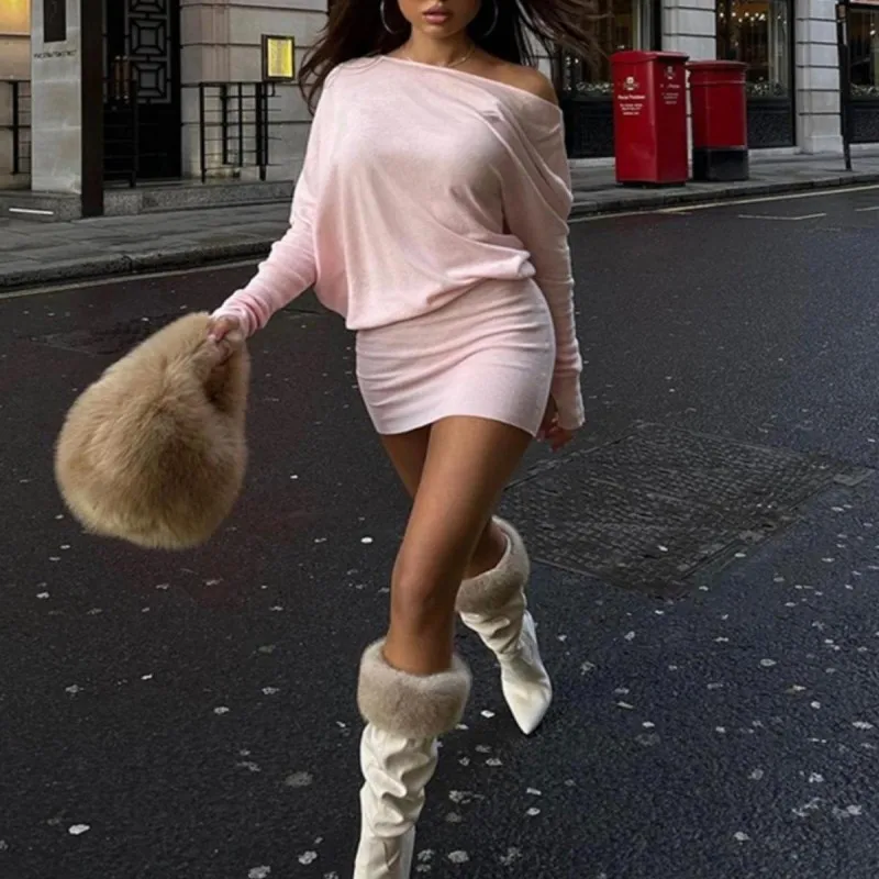 OEM Custom Women's Slim Fit Asymmetrical Neck Bodycon Dress -Long Sleeve Blouse Dress for Wholesale