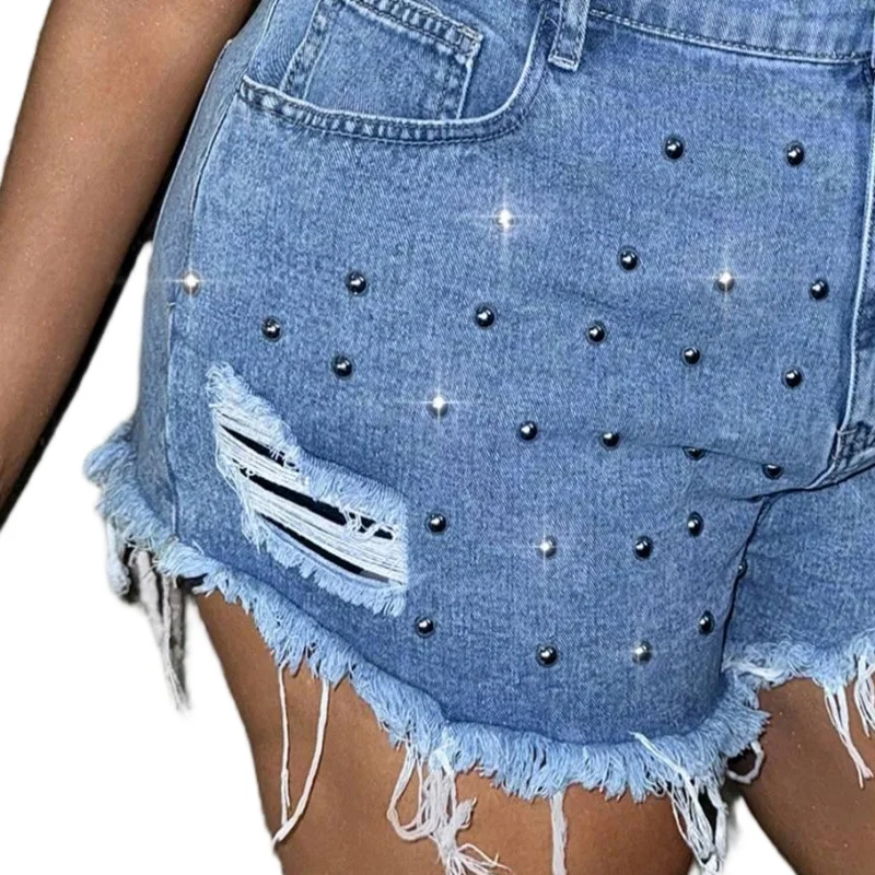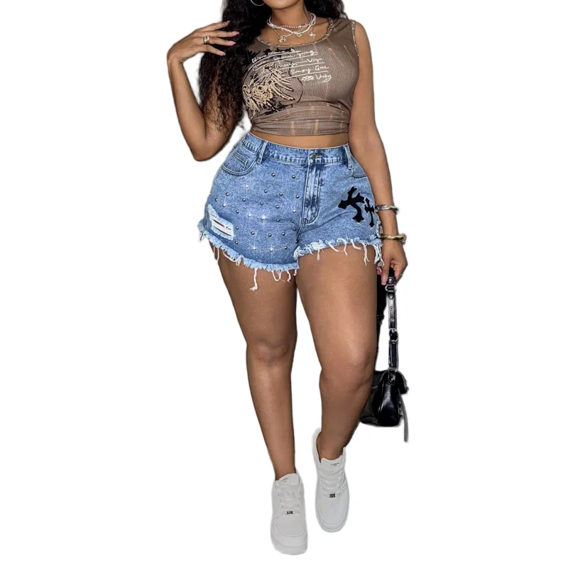 OEM/ODM Factory Custom 2025 Summer Vintage Denim Shorts - High Waist Ripped with Rivet Embroidery for Street