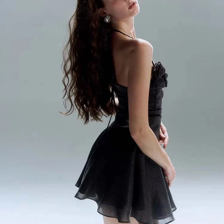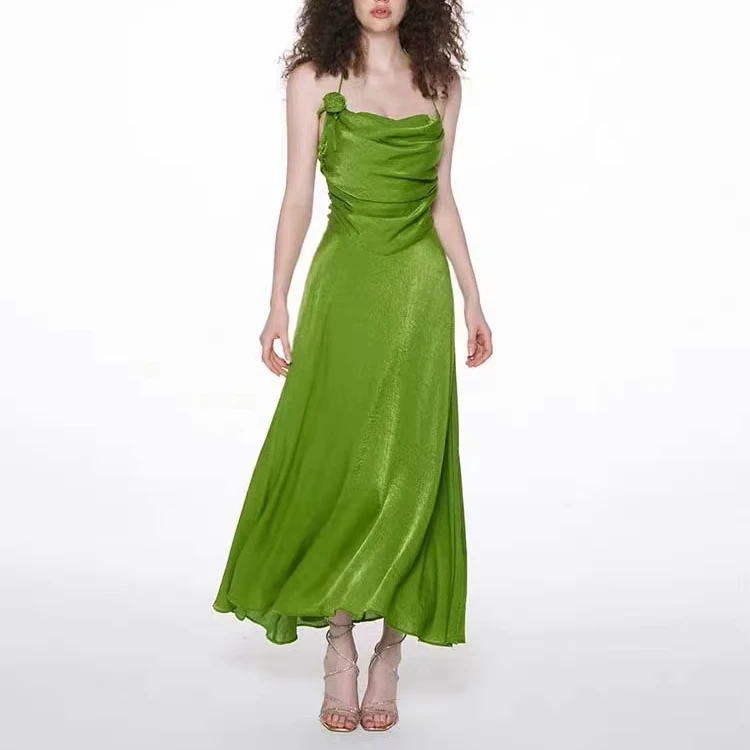 Gothic Moss Green Shirring Shimmer Rose Applique Halter Dresses for Women