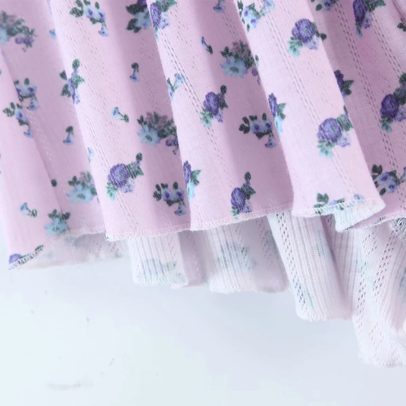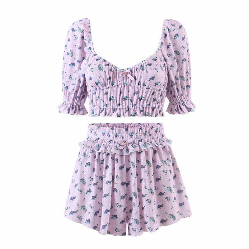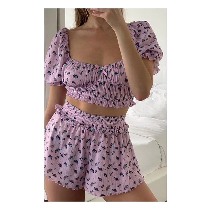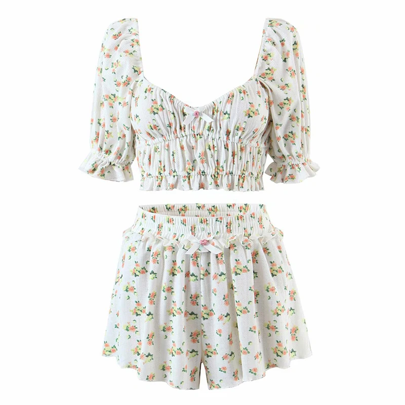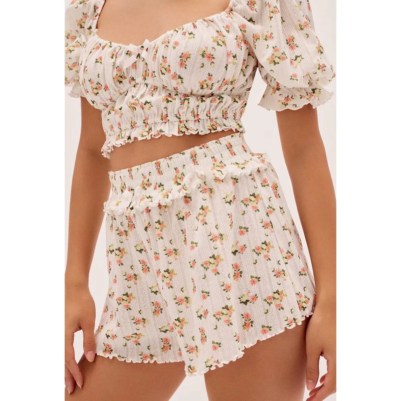 Women's Sweet Floral Printed Ruffle Crop Top Soft Knitted Lounge Wear Breathable Summer Short Length Clothing