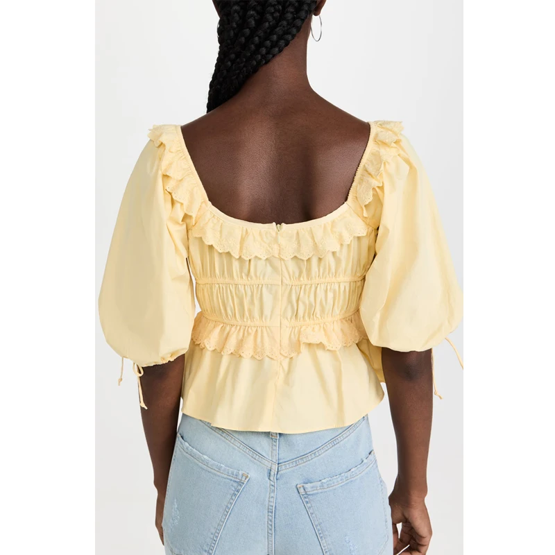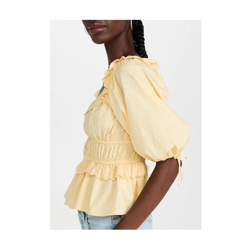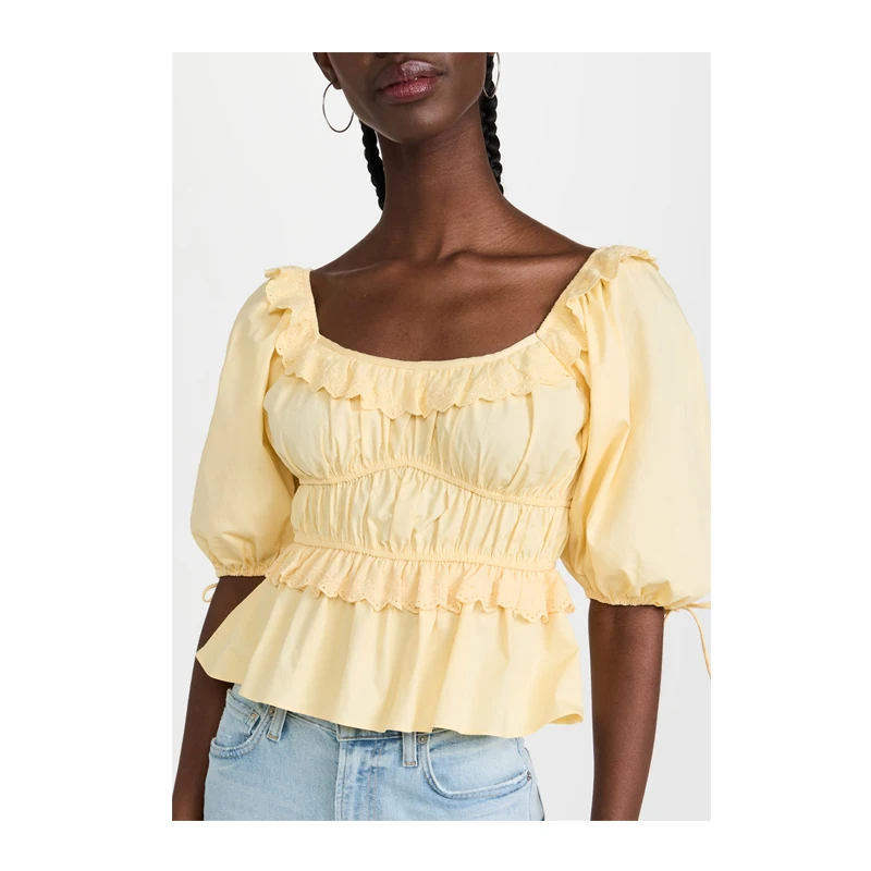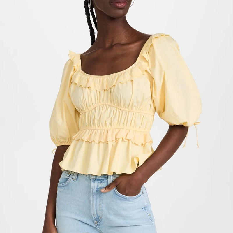 Scoop Round Boat Neck Lace Trim Frill Shirred Half Sleeve Peplum Tops for Women