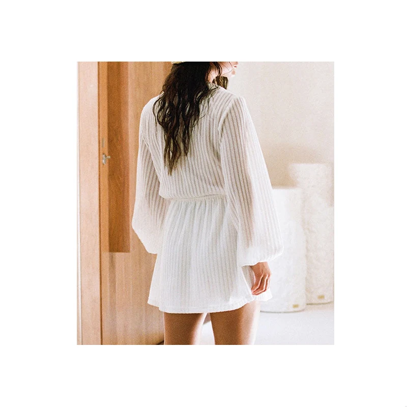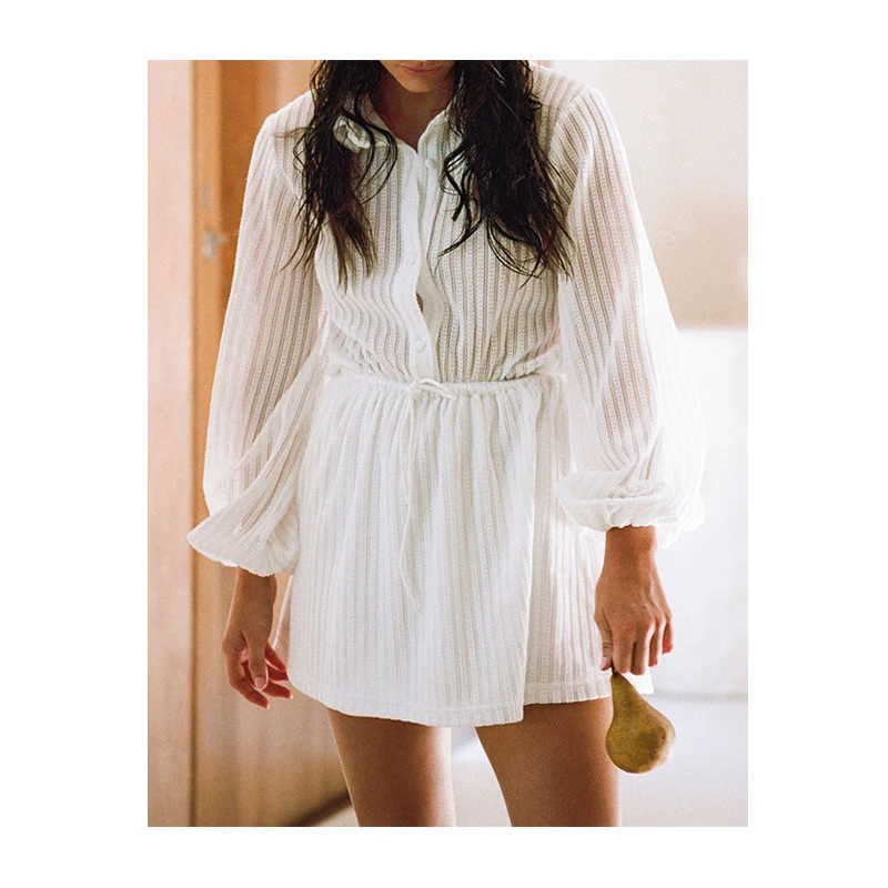Semi-sheer Transparent Striped Waisted Long Sleeve White Shirt Dress