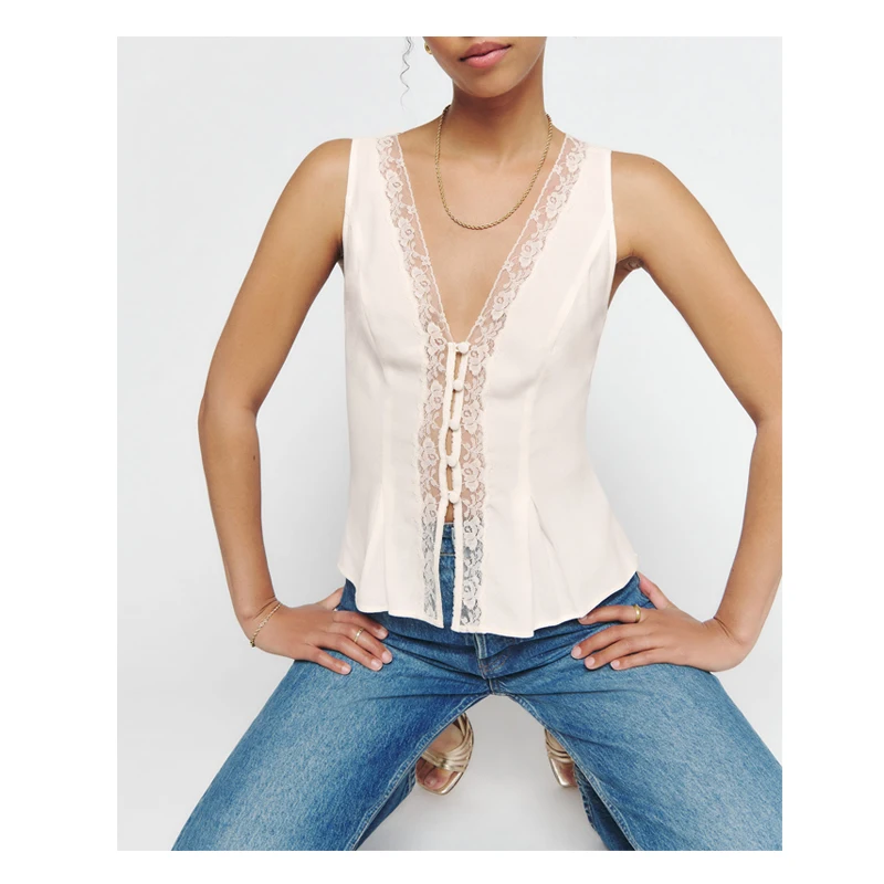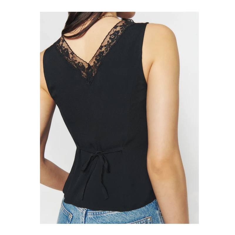Button up v Neck See Through Lace Crepe Sexy Black tank Tops for Women