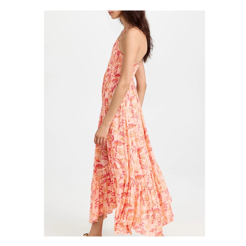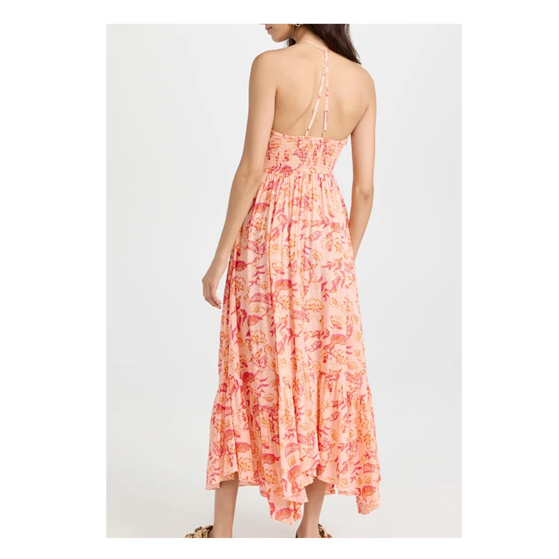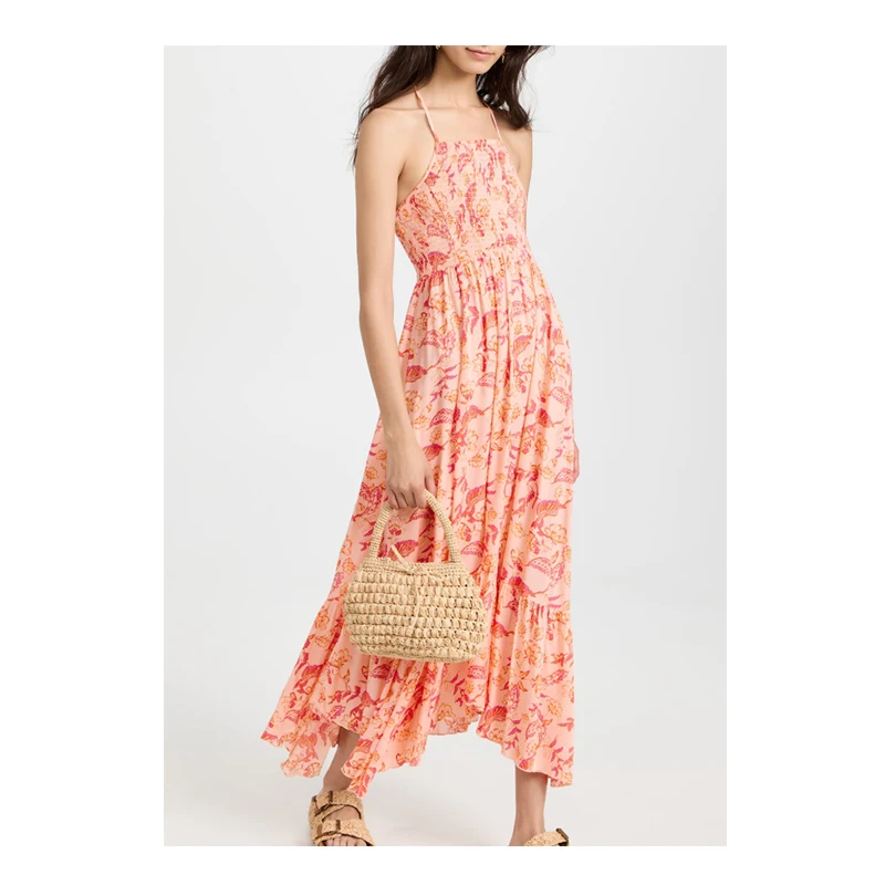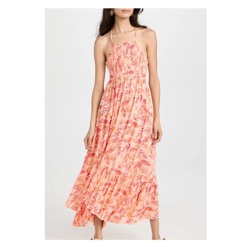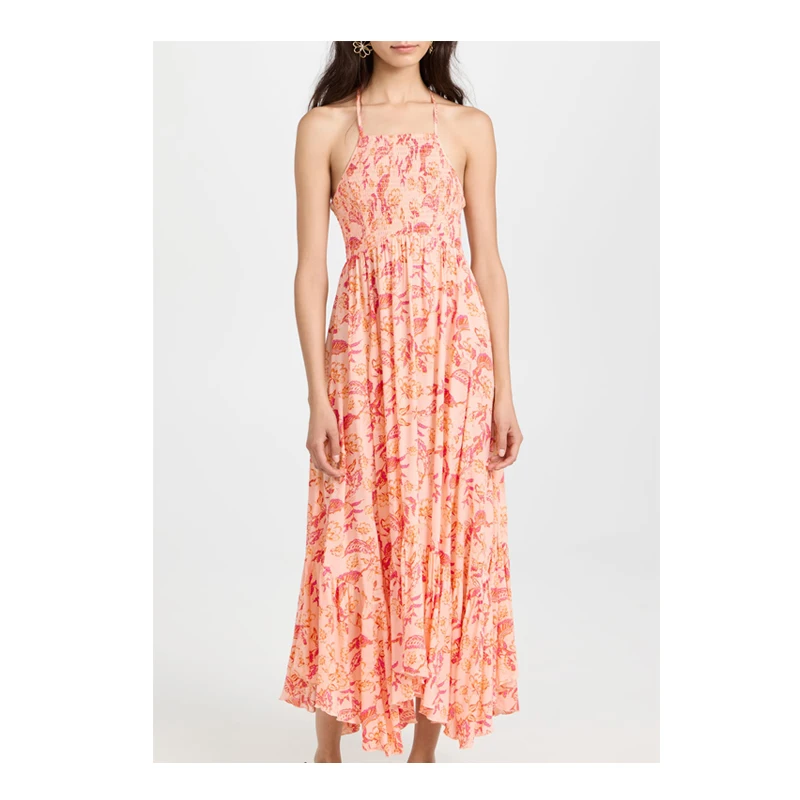 Halter Neck Smocked Floral Printed Rayon Ruffle Bohemian Long Dresses