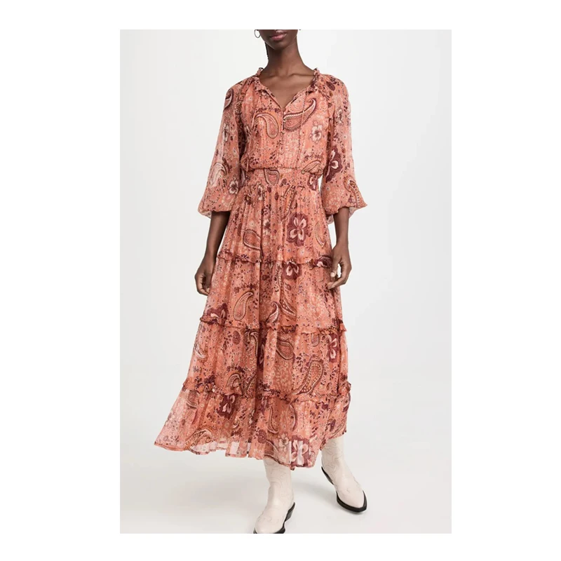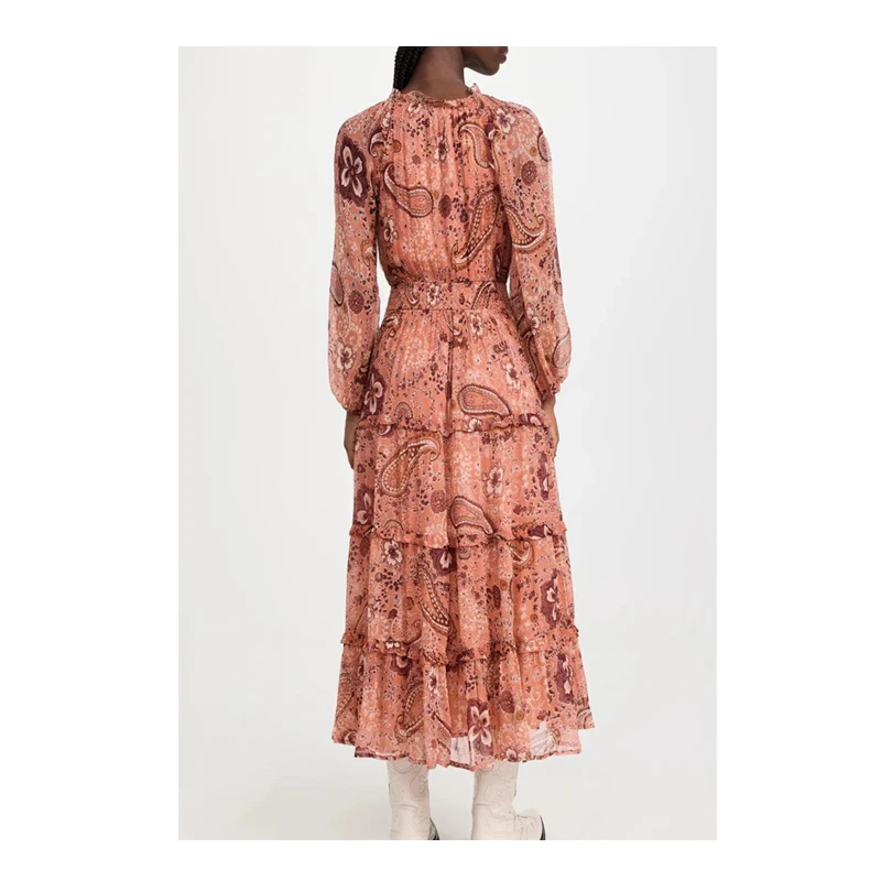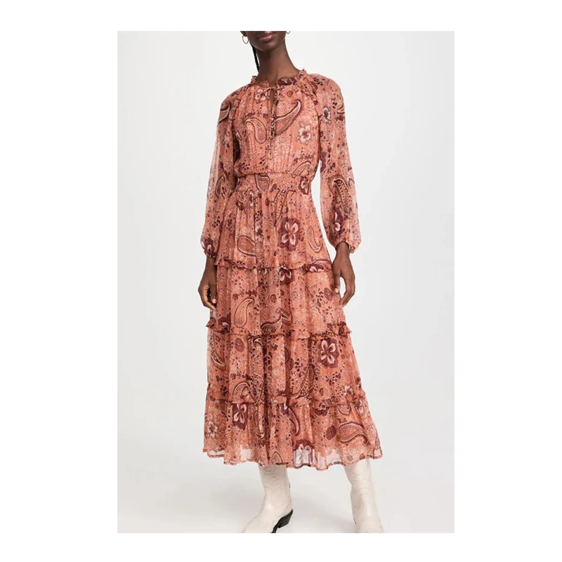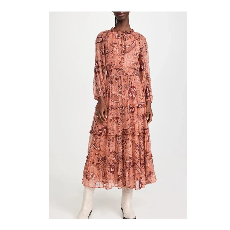 Paisley Print Ruffle Crew Neck Tie Long Sleeve Georgette Tiered Dress for Autumn