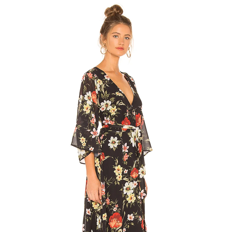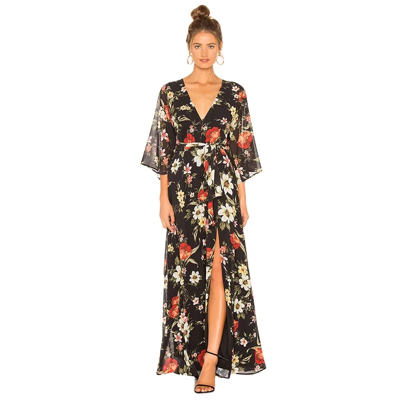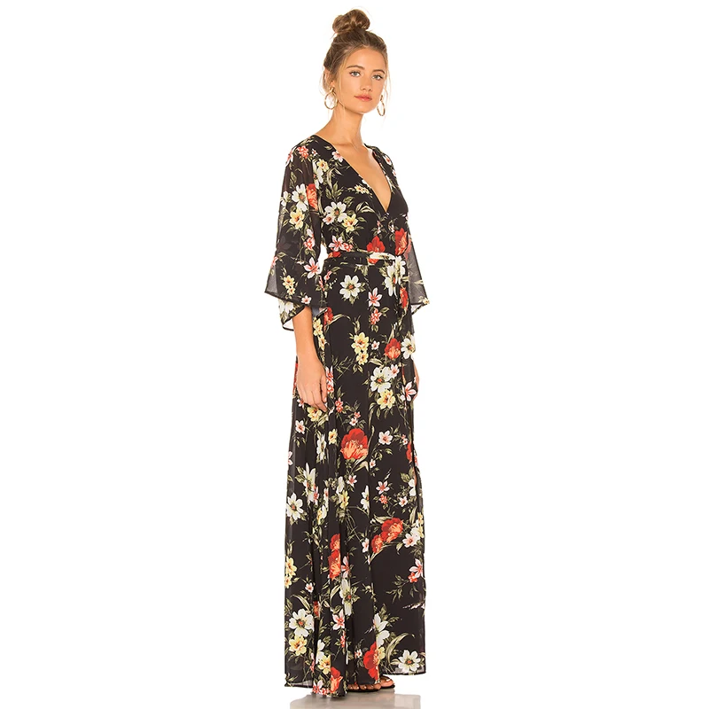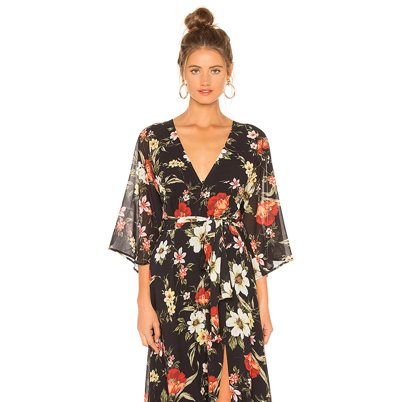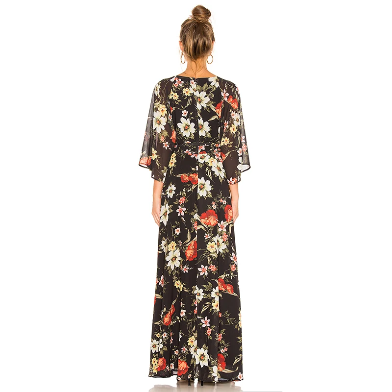 Three Quarter Sleeve Black Chiffon Georgette Floral Maxi Wrap Kimono Dresses