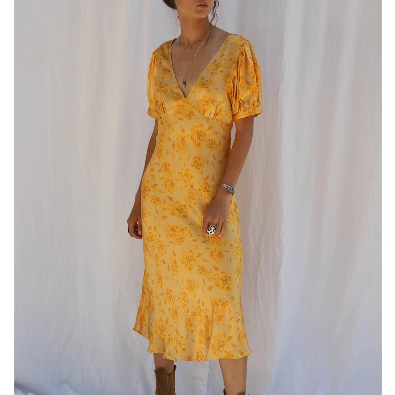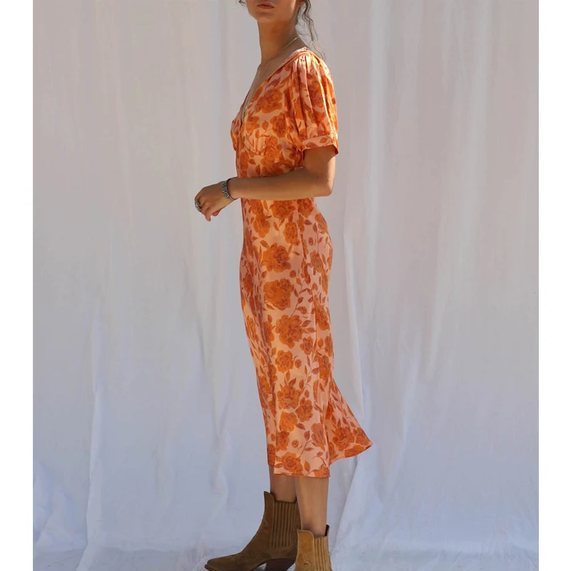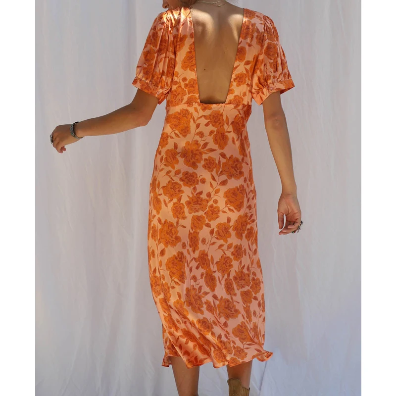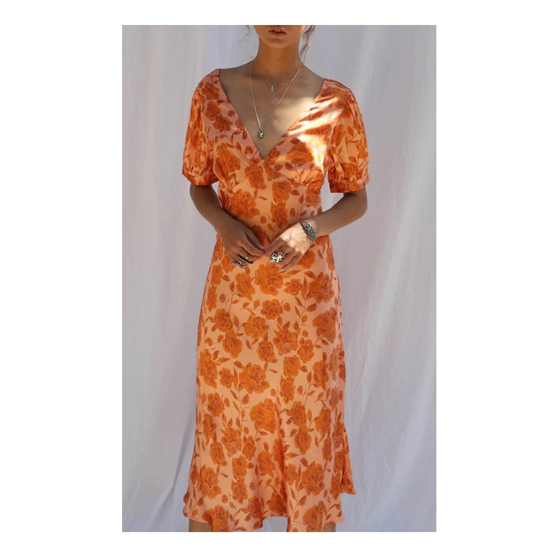 Orange Floral Hippie Printed Gypsy Tea Dress Short Sleeve v Neck Midi Dresses