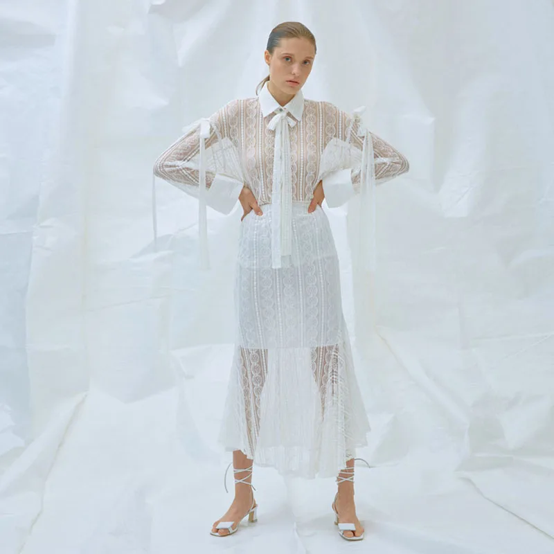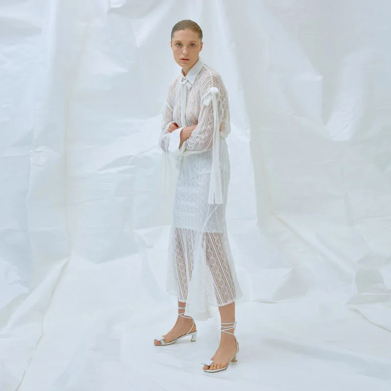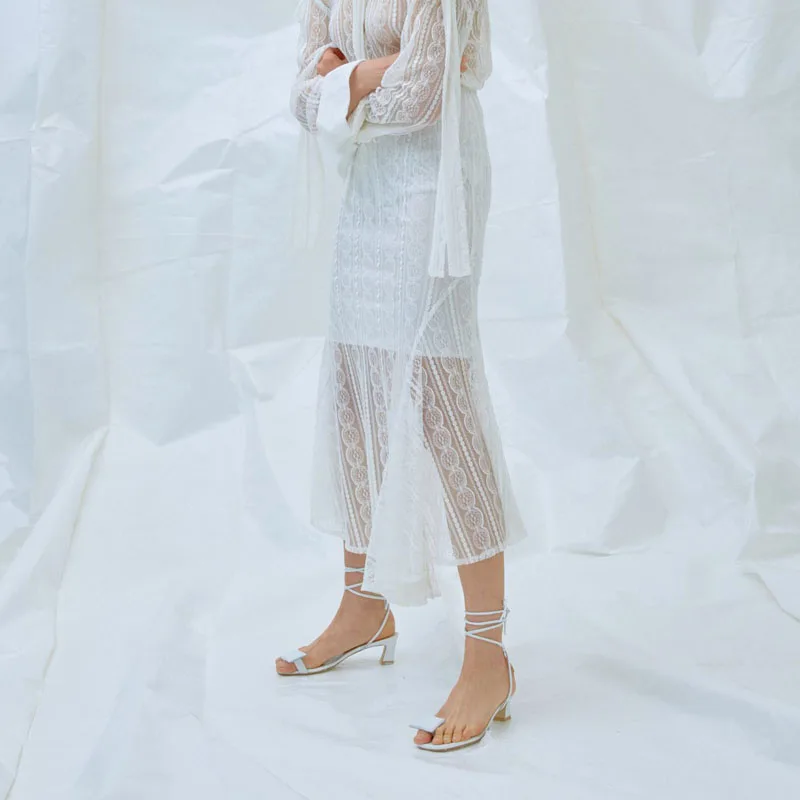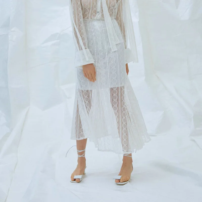 Pure White Half Lined Transparent Mesh Fish Cut Maxi Lace Skirt