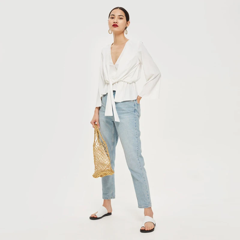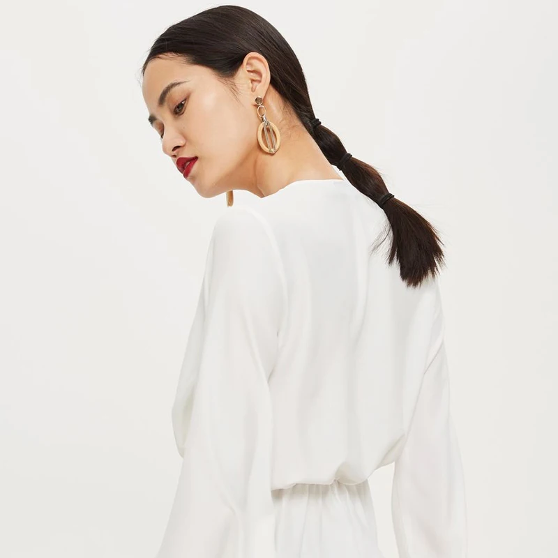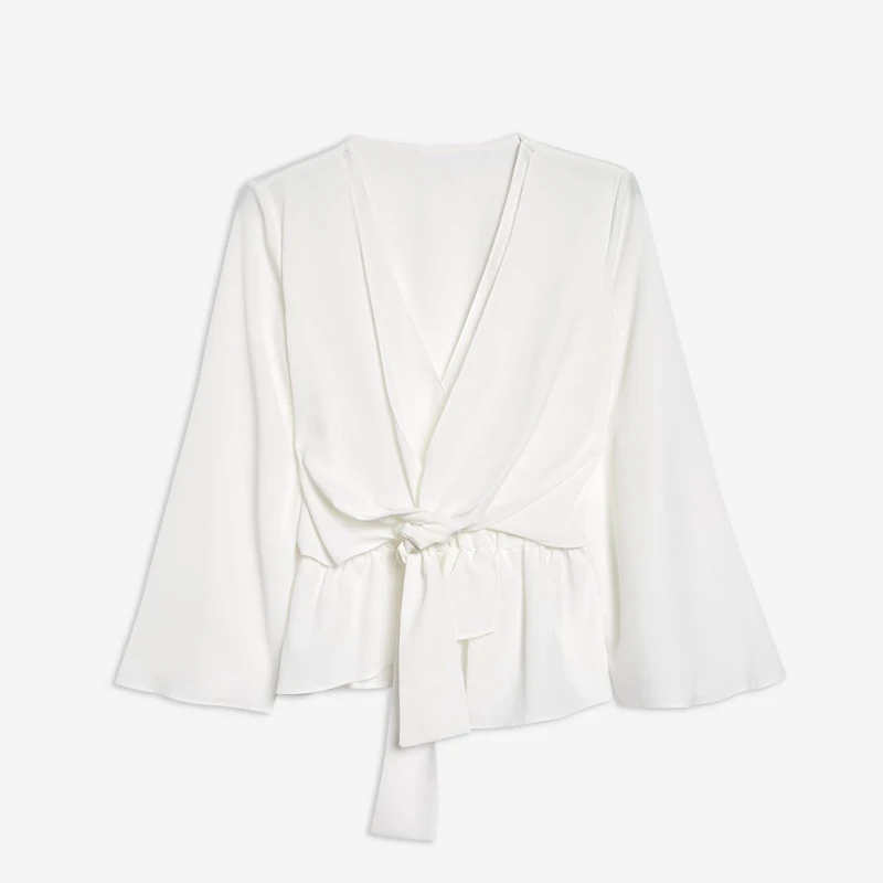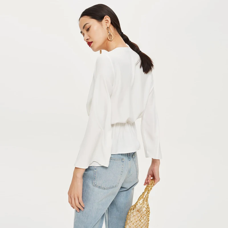 Silky Chiffon Waisted Long Sleeve White Wrap Tops for Women