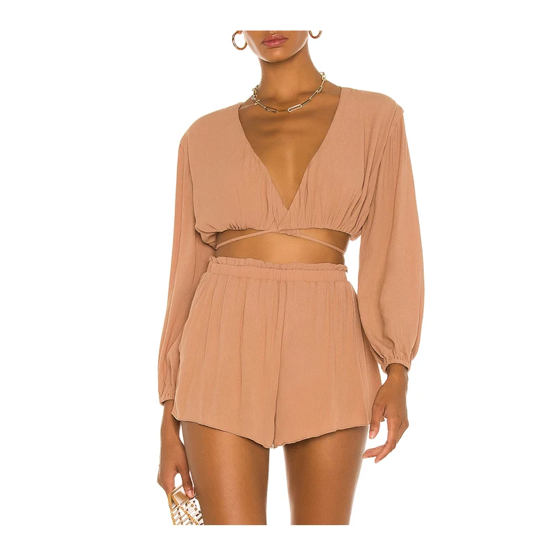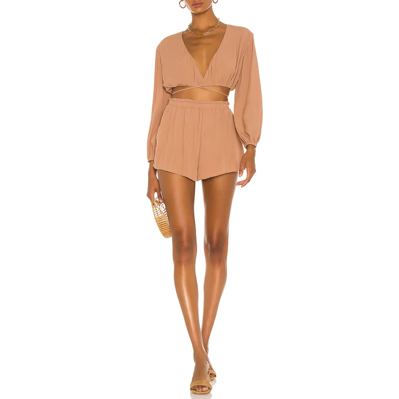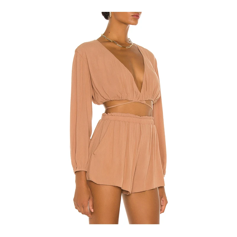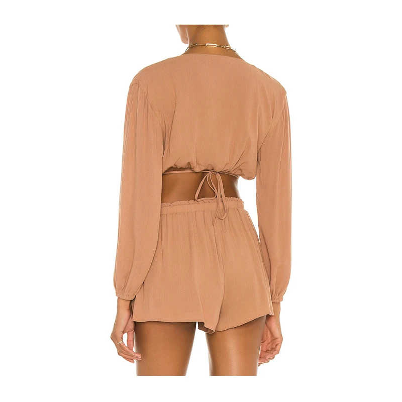 Lace up Tie Back Long Sleeve Wrap Tops High Waist Cotton Shorts