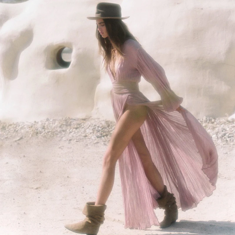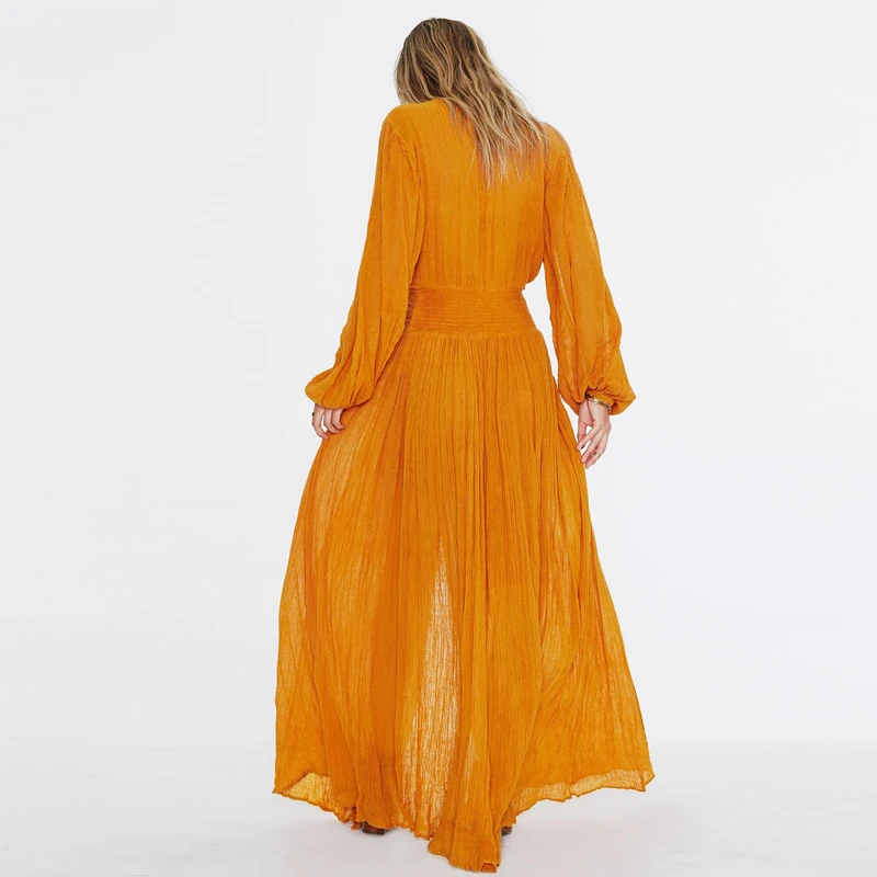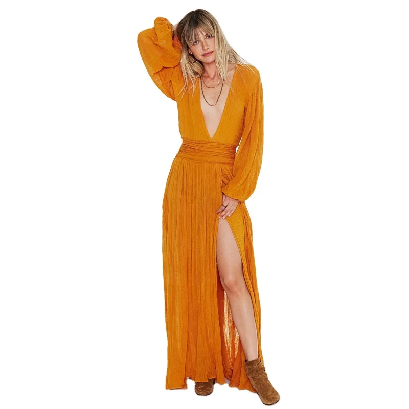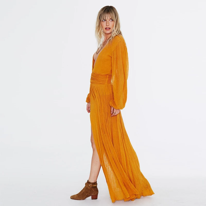 Deep Plunging Sexy Long Sleeve Pleated Gown Boho Hippie High Slit Linen Maxi Dress
