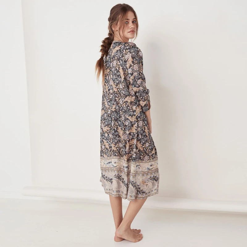 Earth Tone Boho Long Kimono for Women Printed Rayon Floral Beach Wear