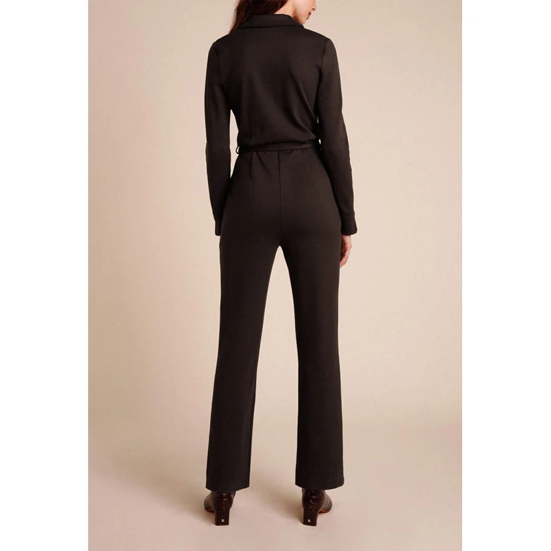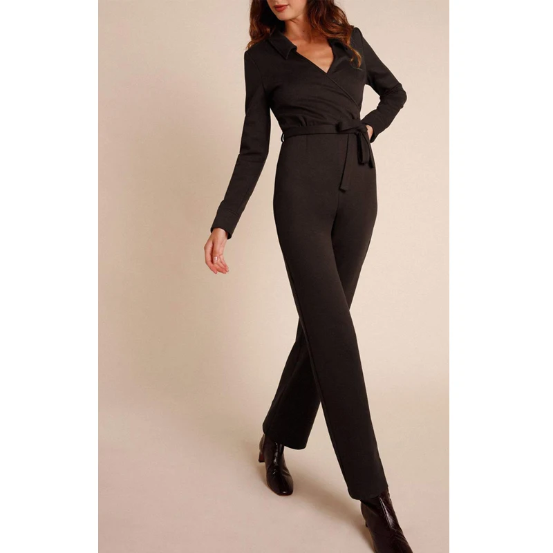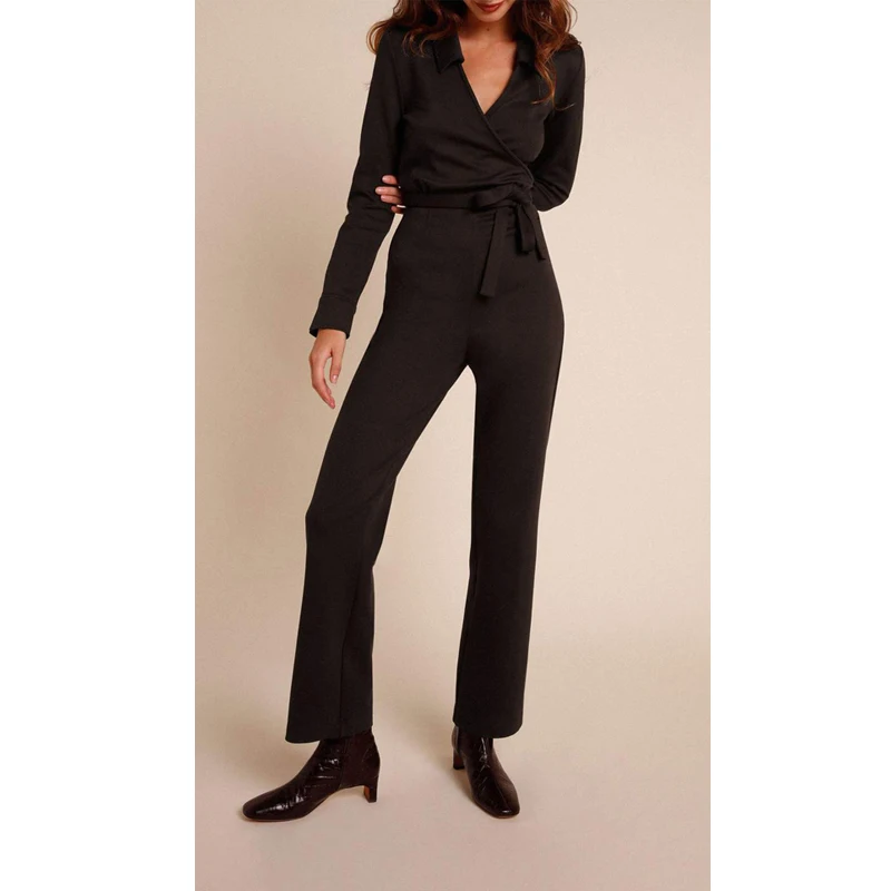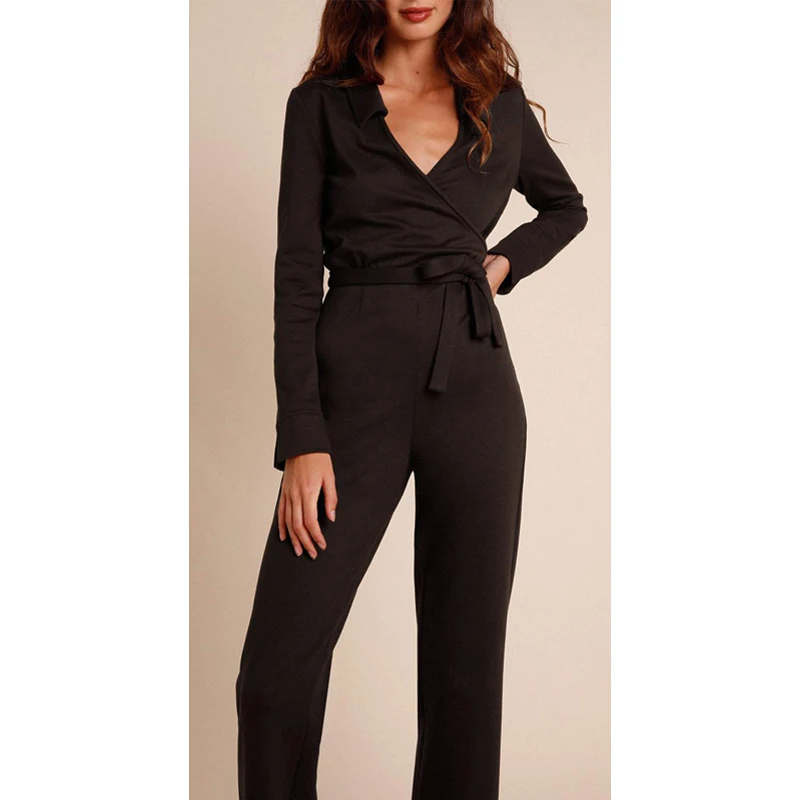 Career Office Lady's Daily Black Long Sleeve Formal Autumn v Neck Tie Jumpsuits