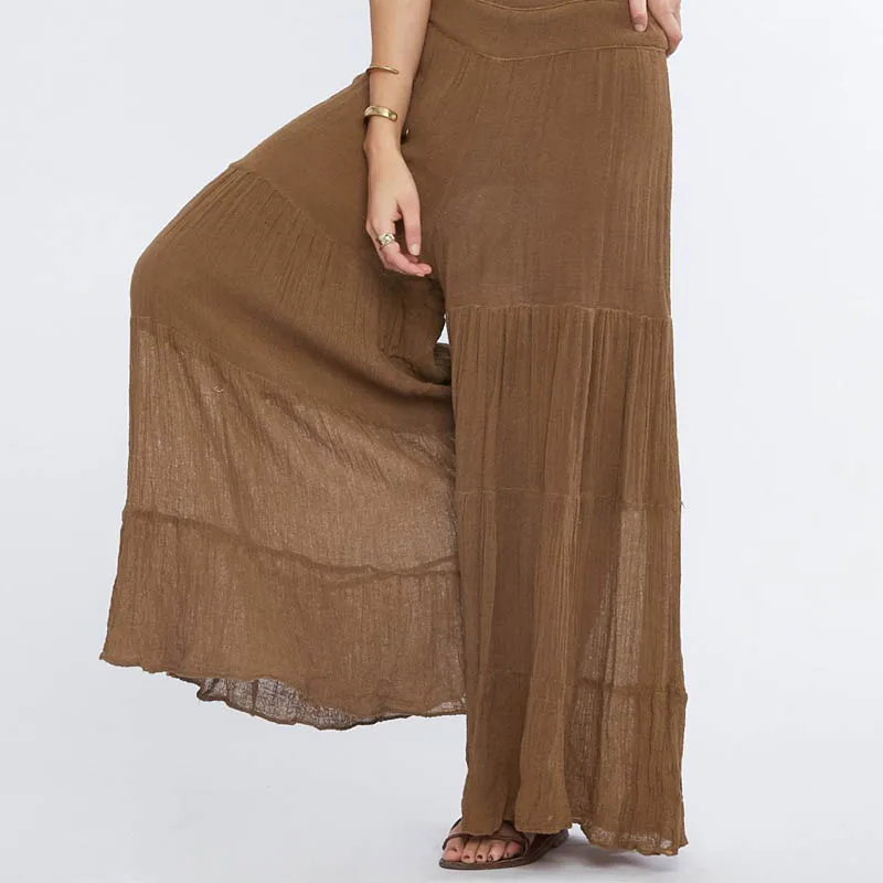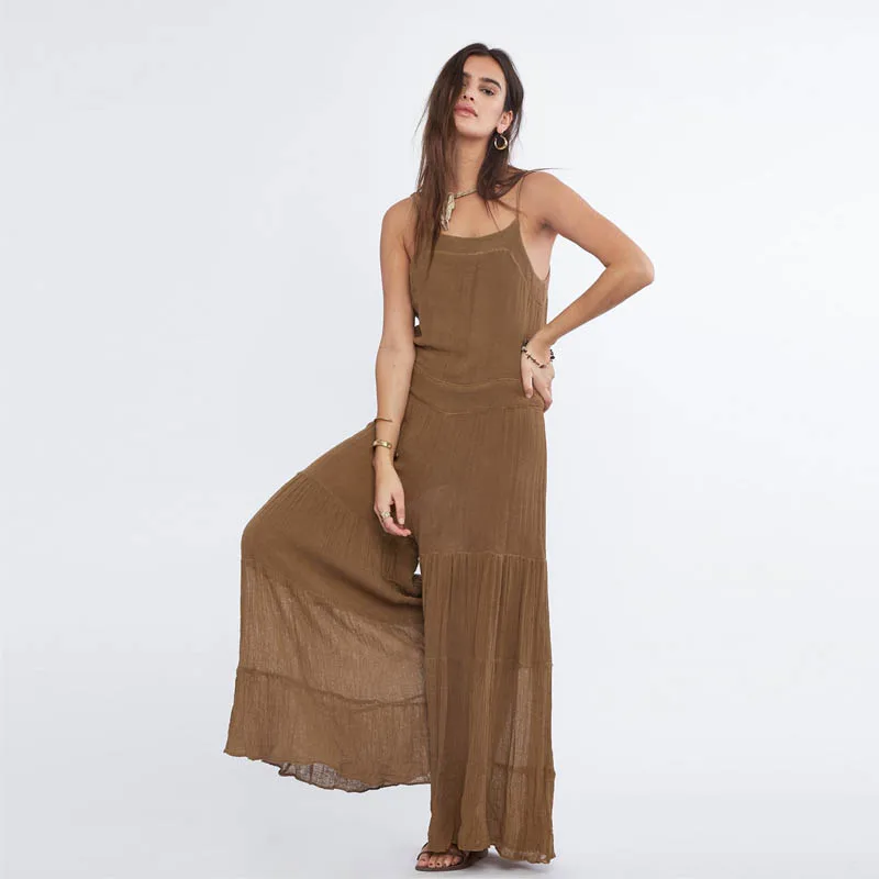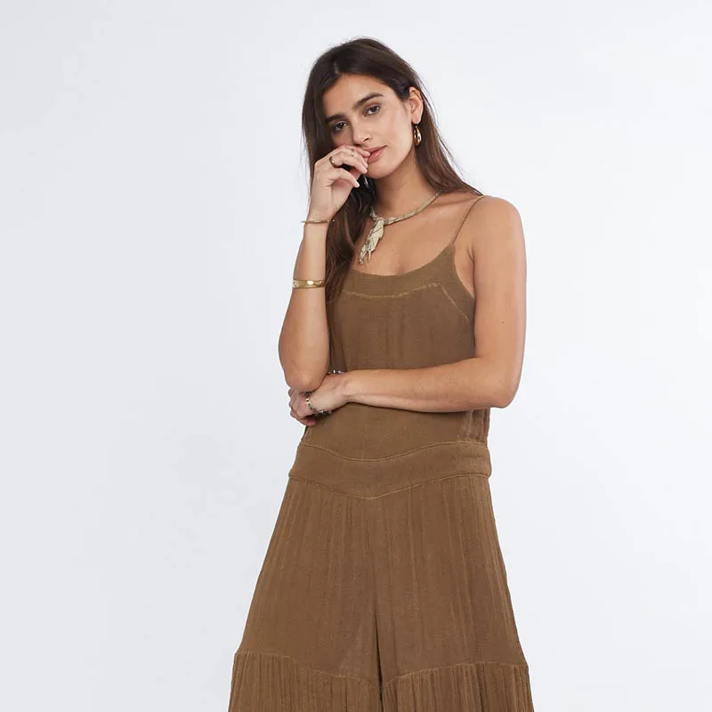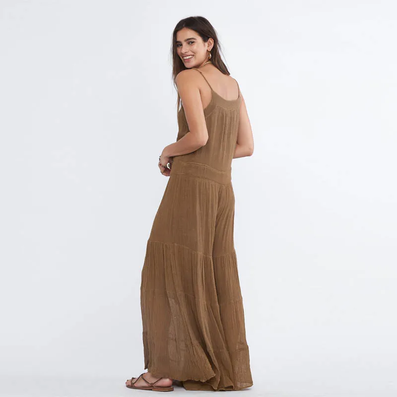 Flowing Cotton Crepe Khaki Boho Hippie Pleated Wide Leg Jumpsuits