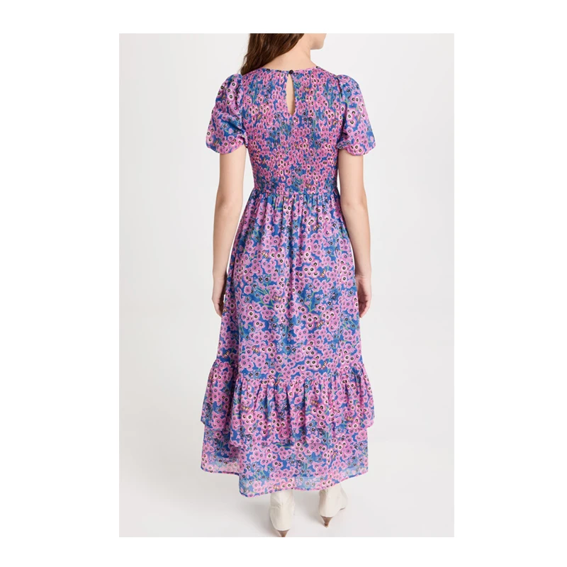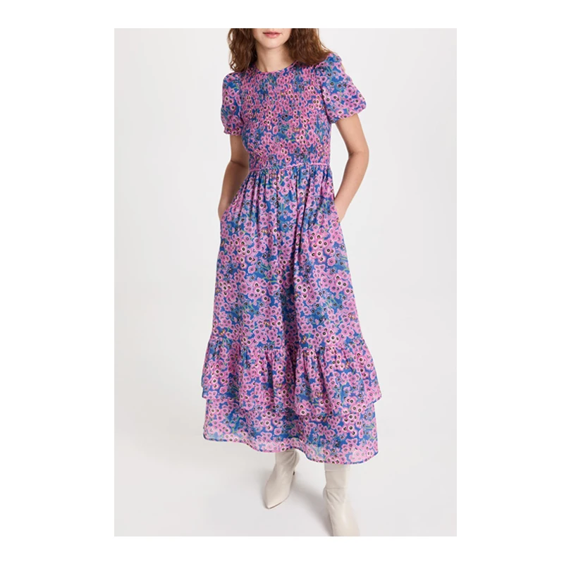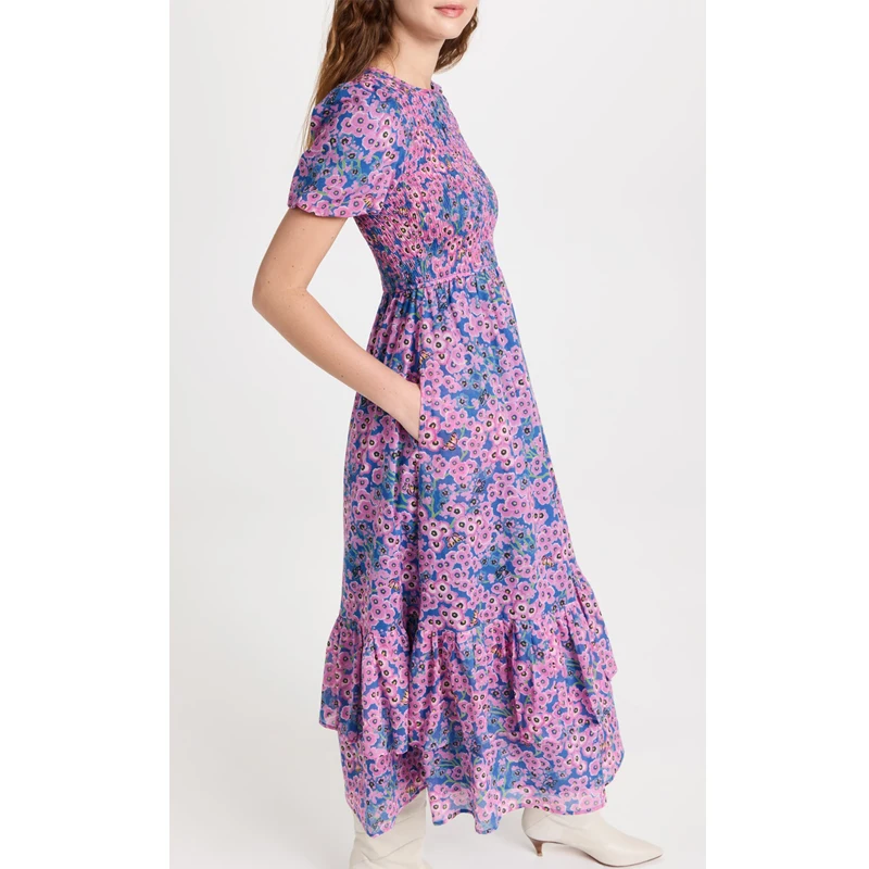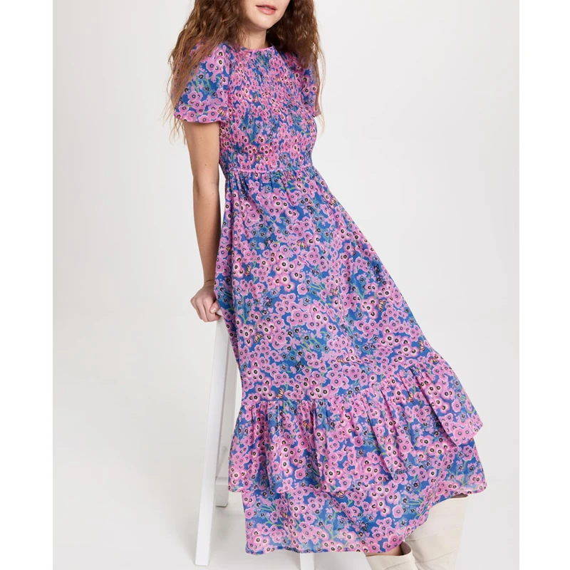 Pink and Blue Floral Print Smocked Short Sleeve Ruffle Midi Dresses