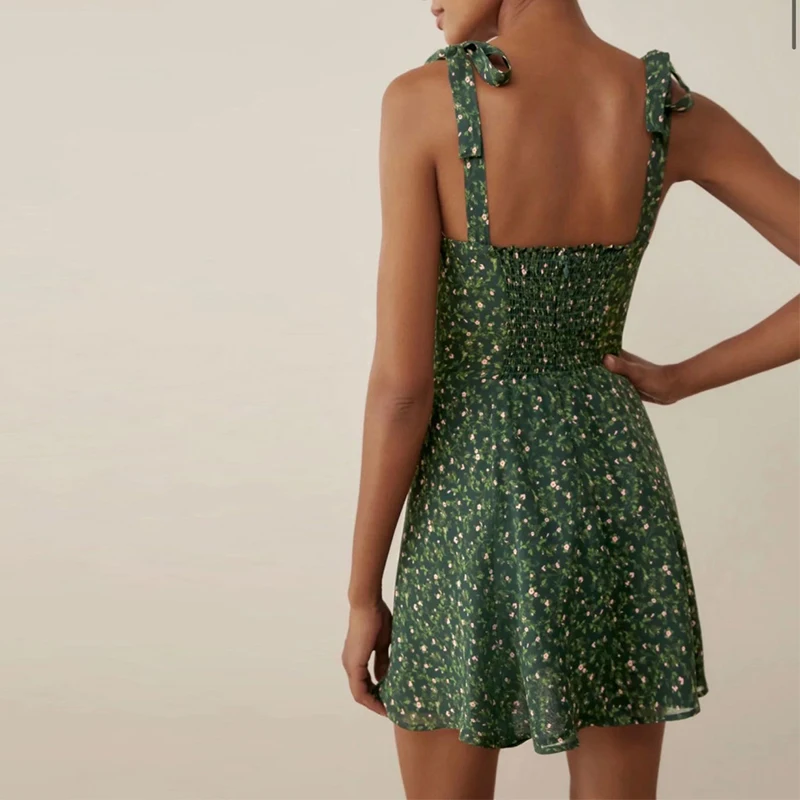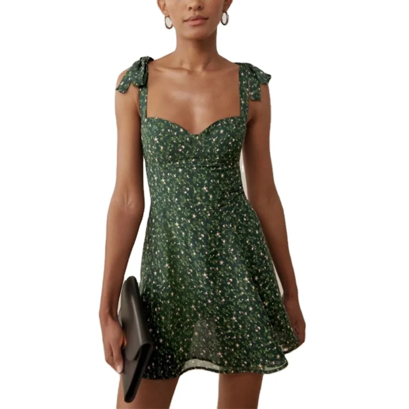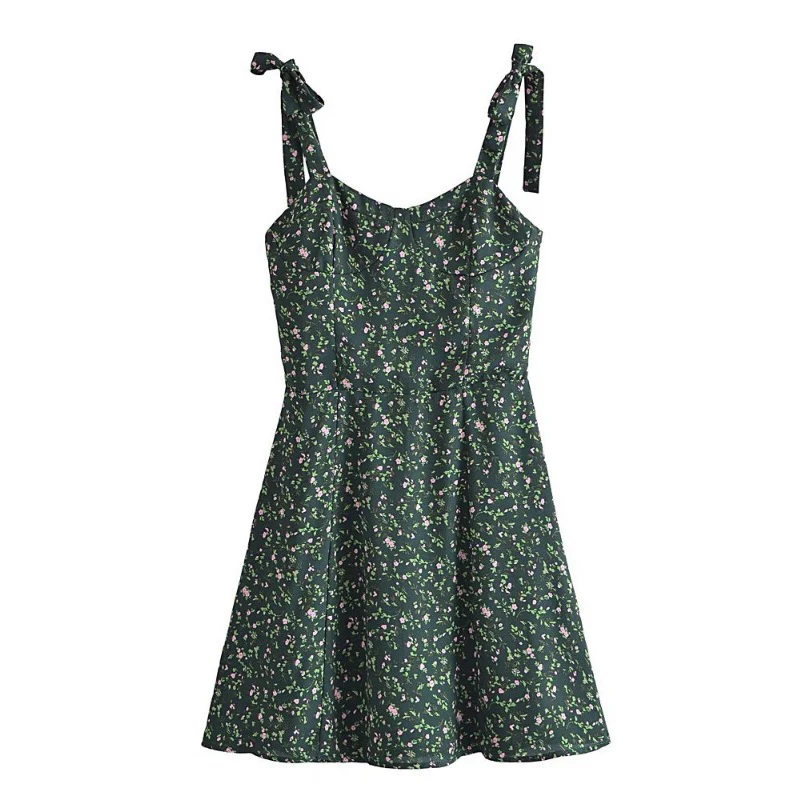 Ladies Summer Dress Women Green Floral Print Casual Mini Dress