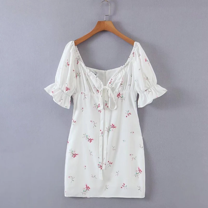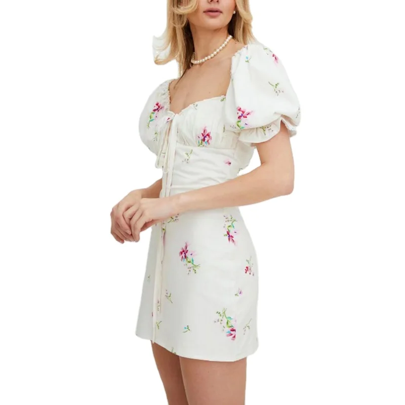 Women Short Puffy Sleeve Floral Print Summer Casual Dress