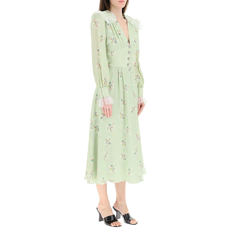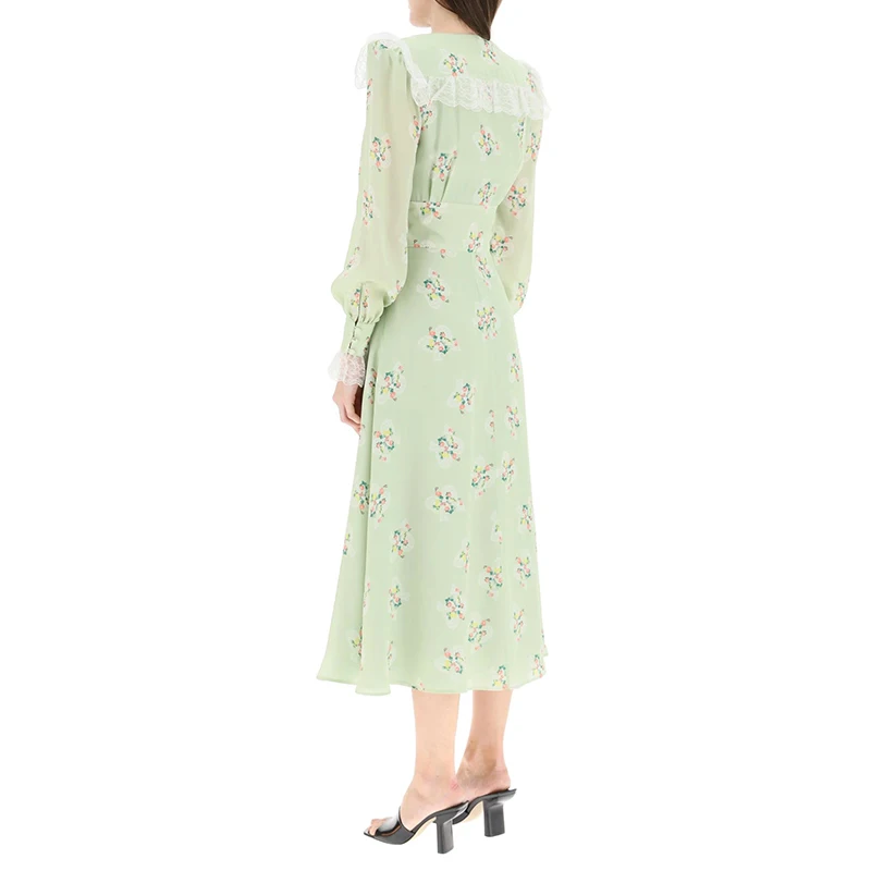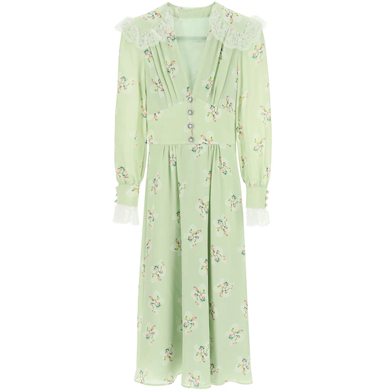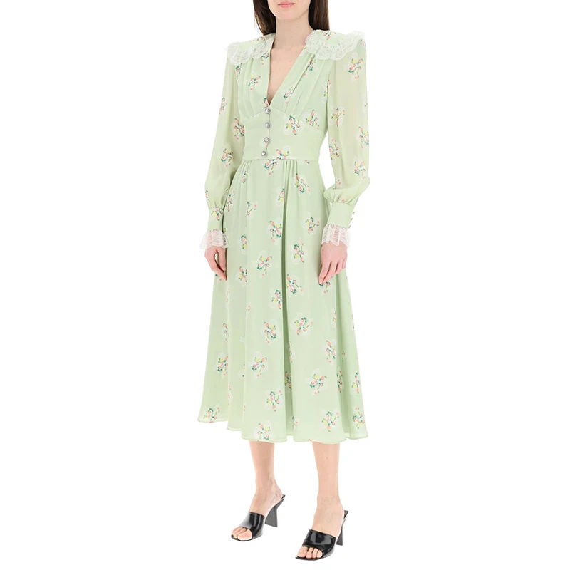 Women Vintage Long Sleeve Floral Print 100% Cotton Midi Dress