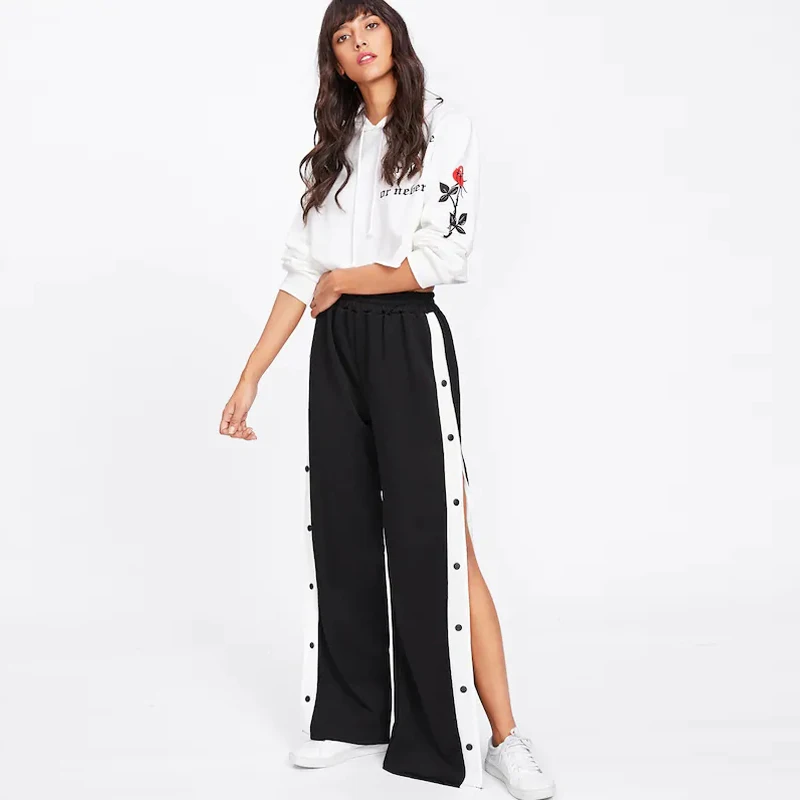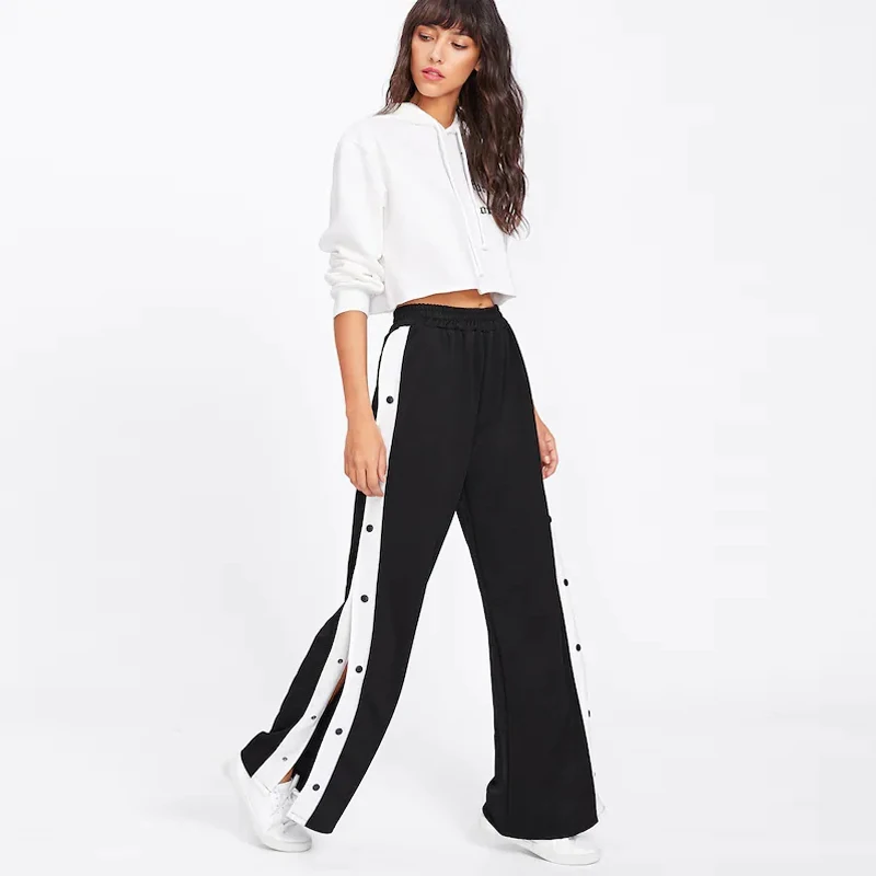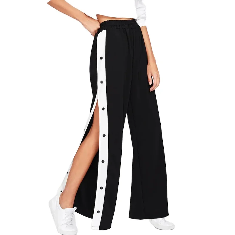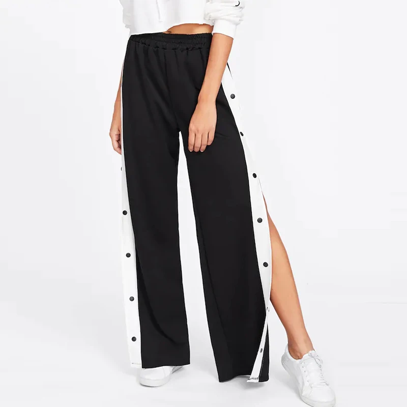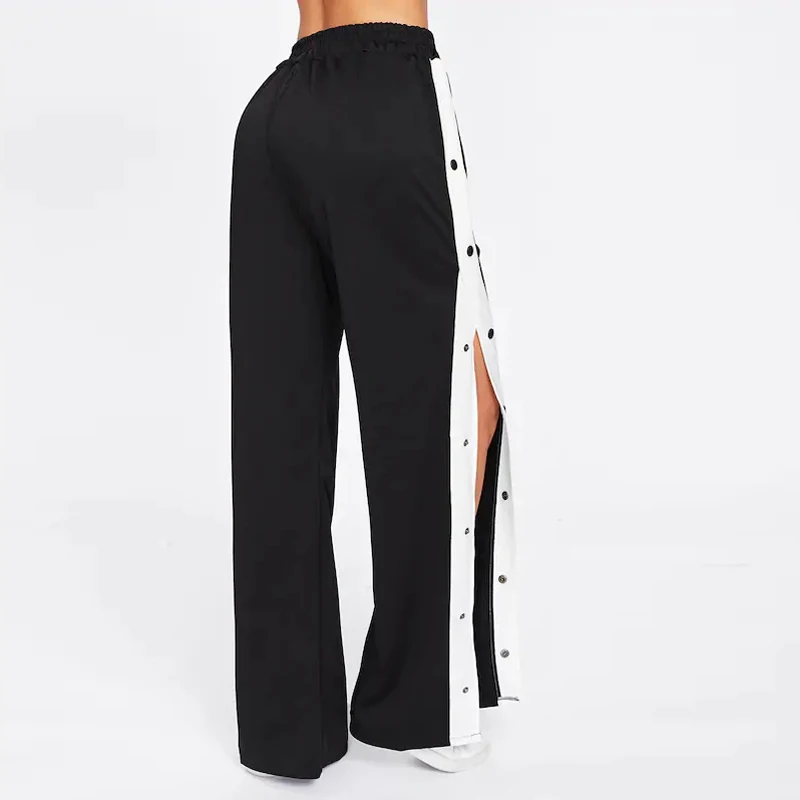 Womens Black Tape Button Side Wide Leg Casual Cotton Sport Pants