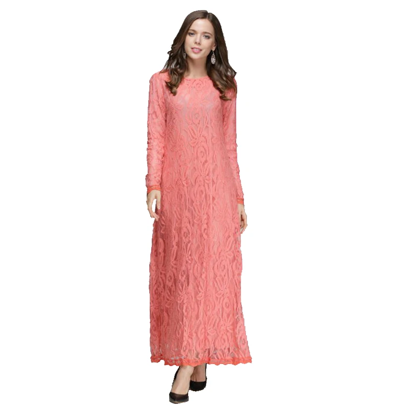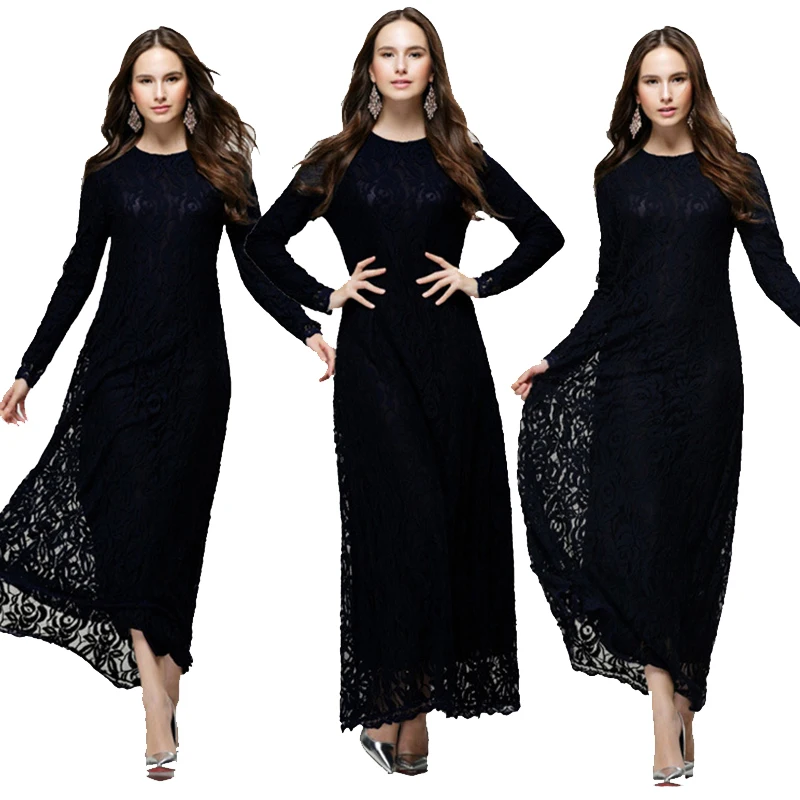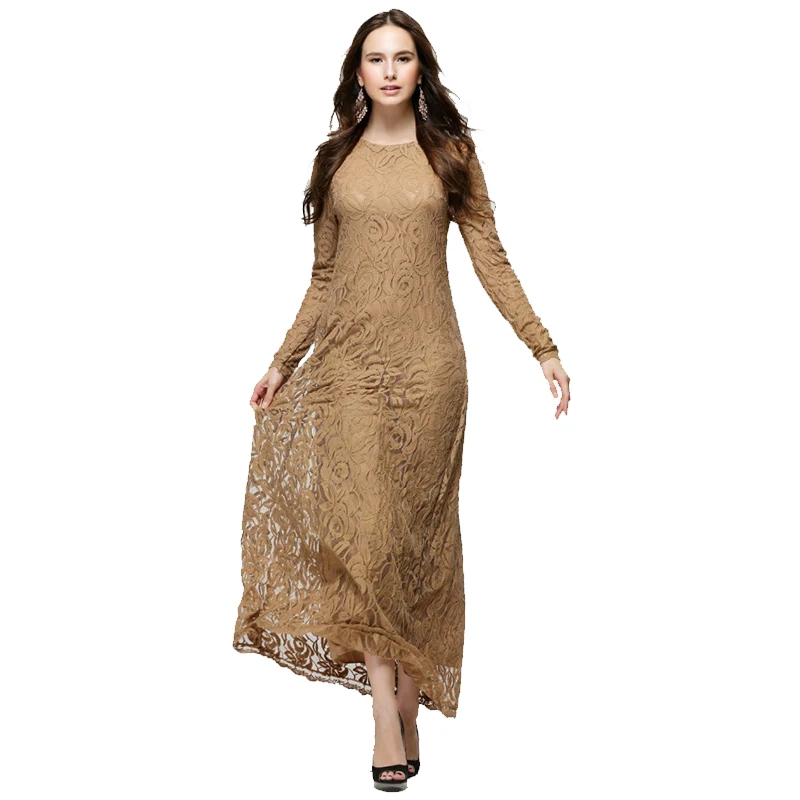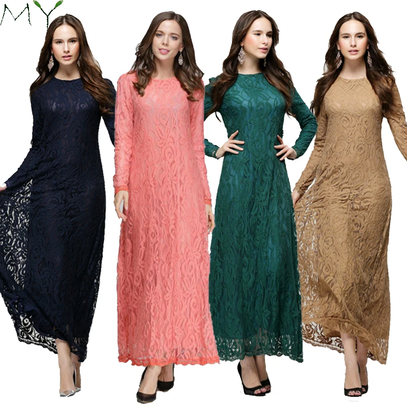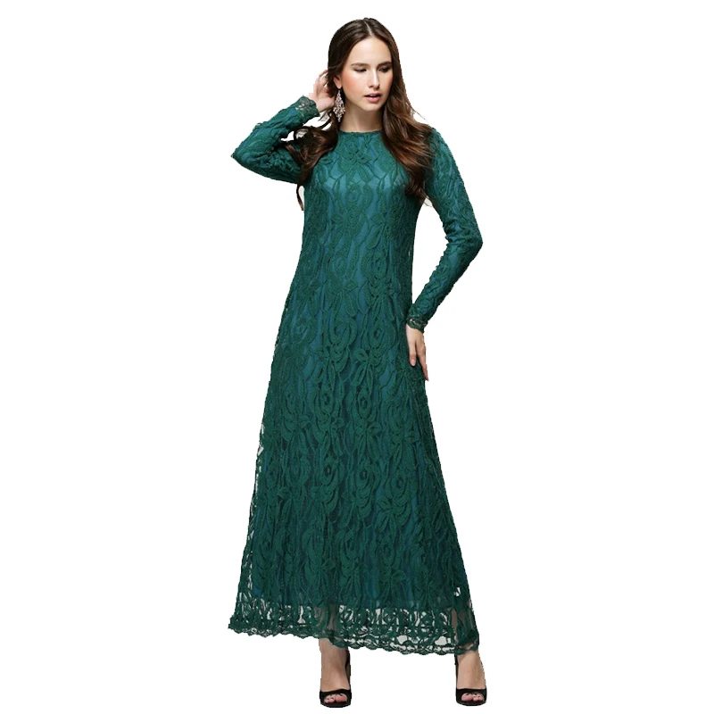 Vintage Islamic Long Lace Clothing Muslim Women Long Sleeve Lace Maxi Dress