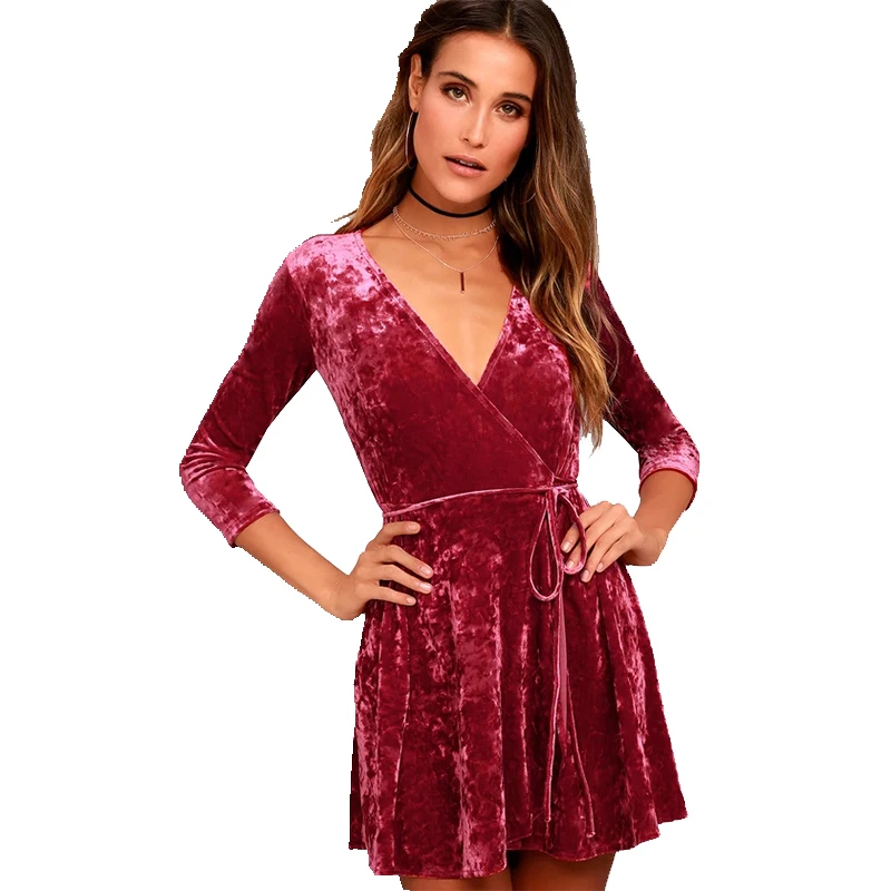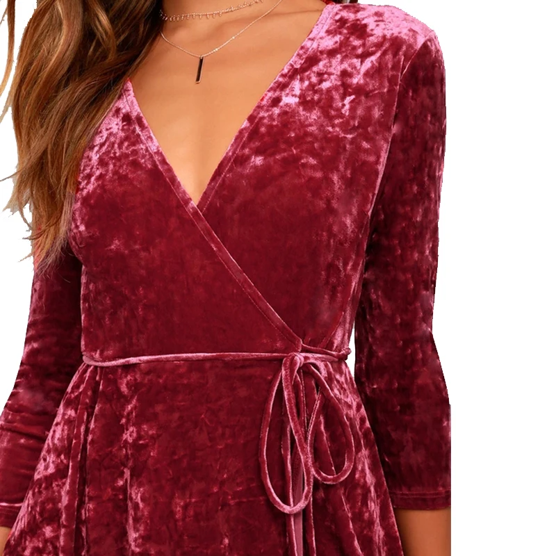 Ladies Fall Velvet Dress Elegant Wine Red Crushed Velvet Wrap Skater Mini Dress