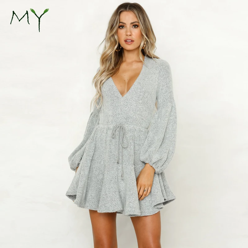 2018 Winter Cut and Sew Knit Wear Puff Sleeve Wrap Dresses for Women