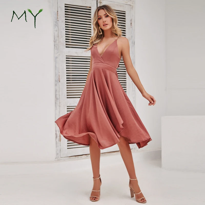 Sexy Sleeveless V-neck and Tie Back Rust Midi Dress