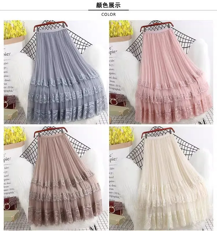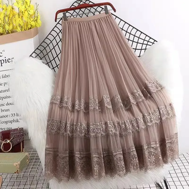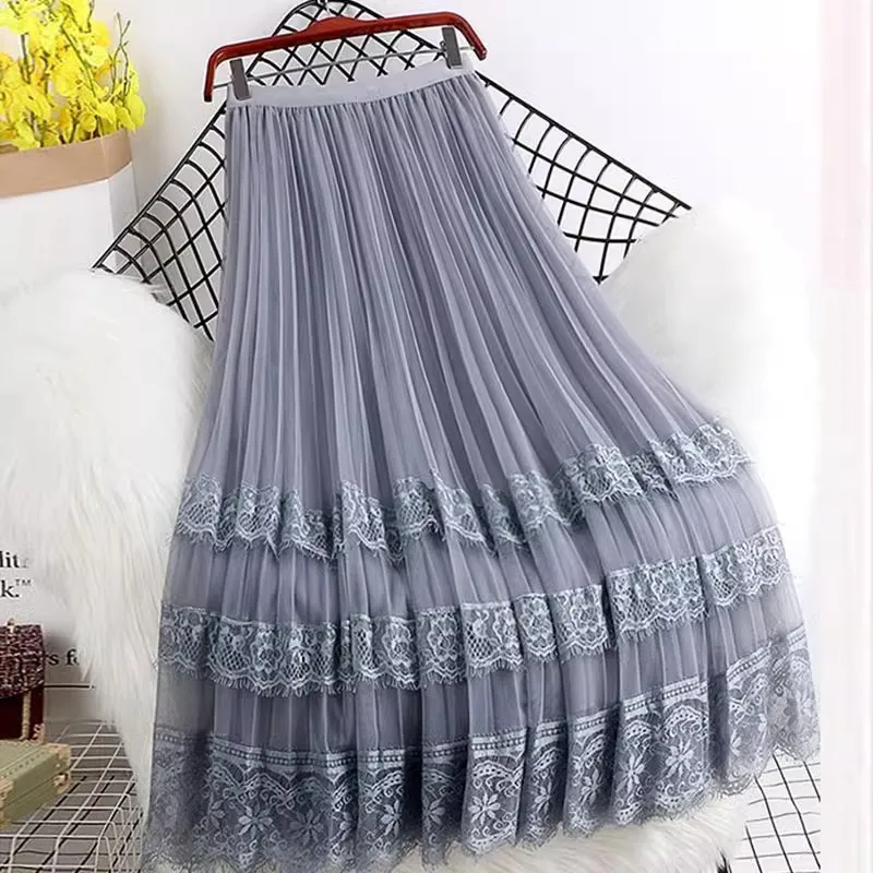 Spring Korean Style New High Waist Lace Stitching Mesh Polyester Anti-Wrinkle Women's Pleated a Midi Skirt