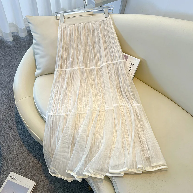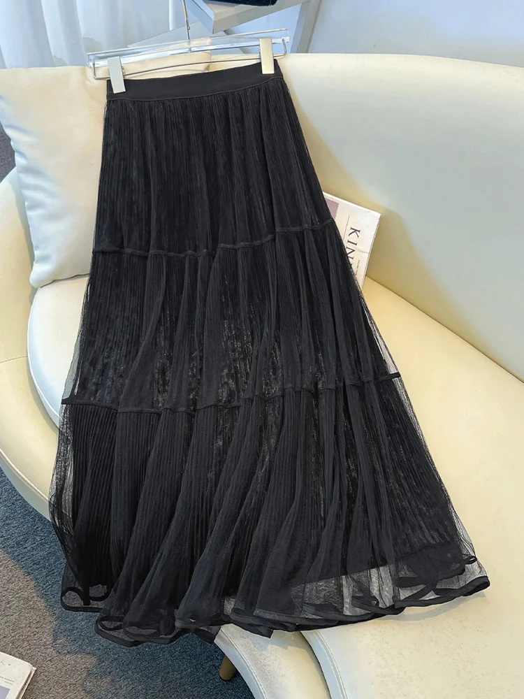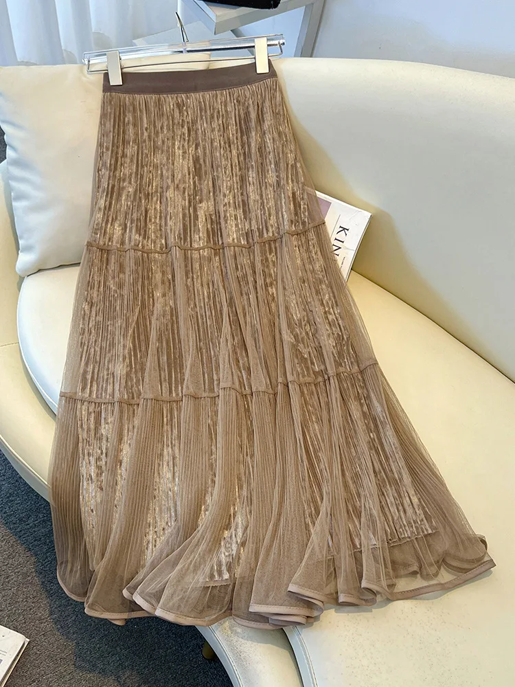 New Velvet Pleated Empire Waist Anti-Wrinkle Women's Autumn Slimming Sweet Design Flannel Midi A-line Skirt