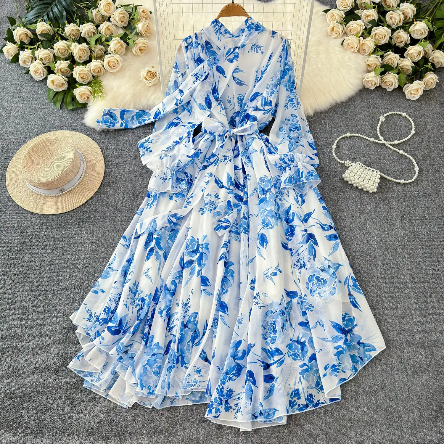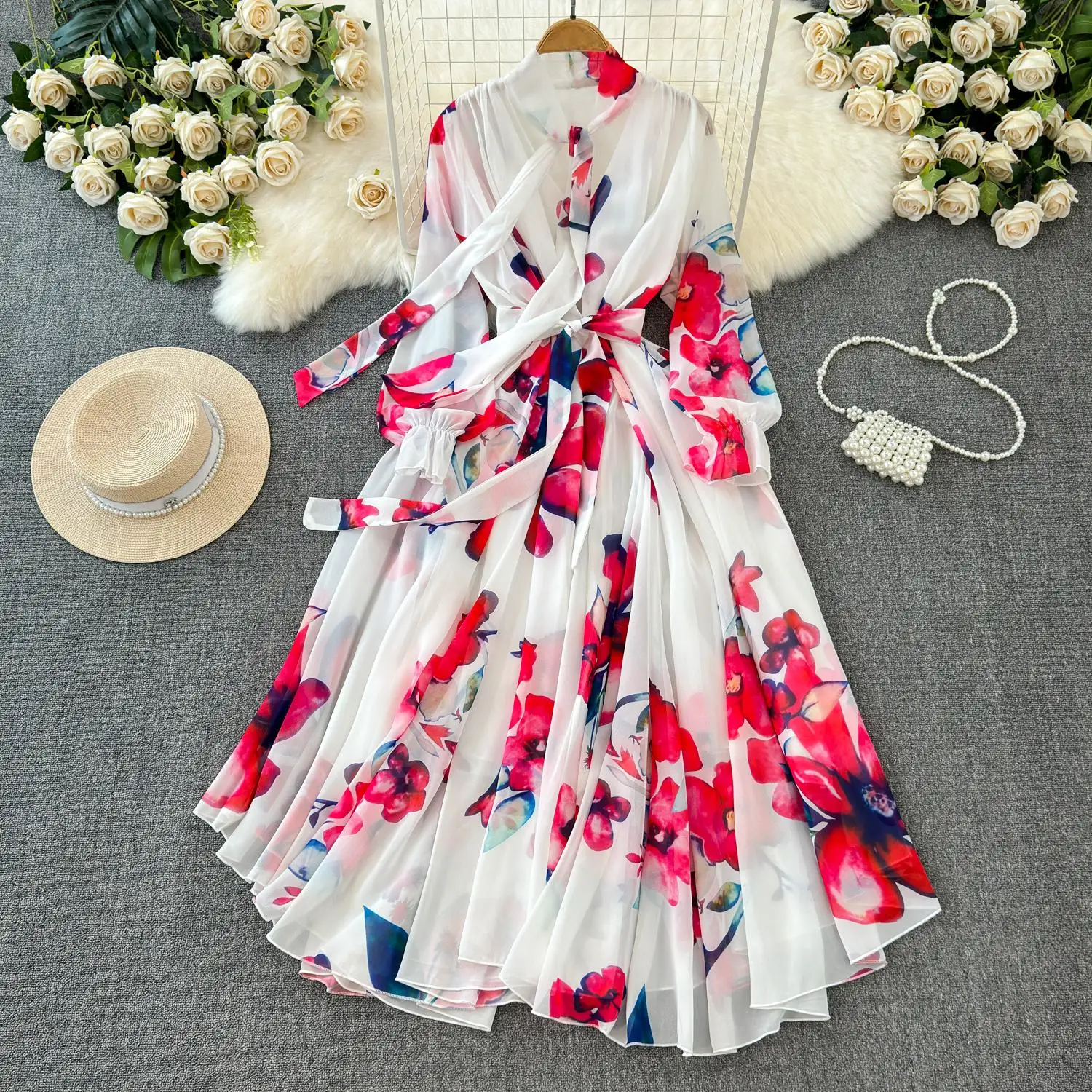 French Elegant Floral Pattern Chiffon Dress for Women Spring Summer Casual Slim-Fit Large Swing Lace-up Bow Collar for Vacation