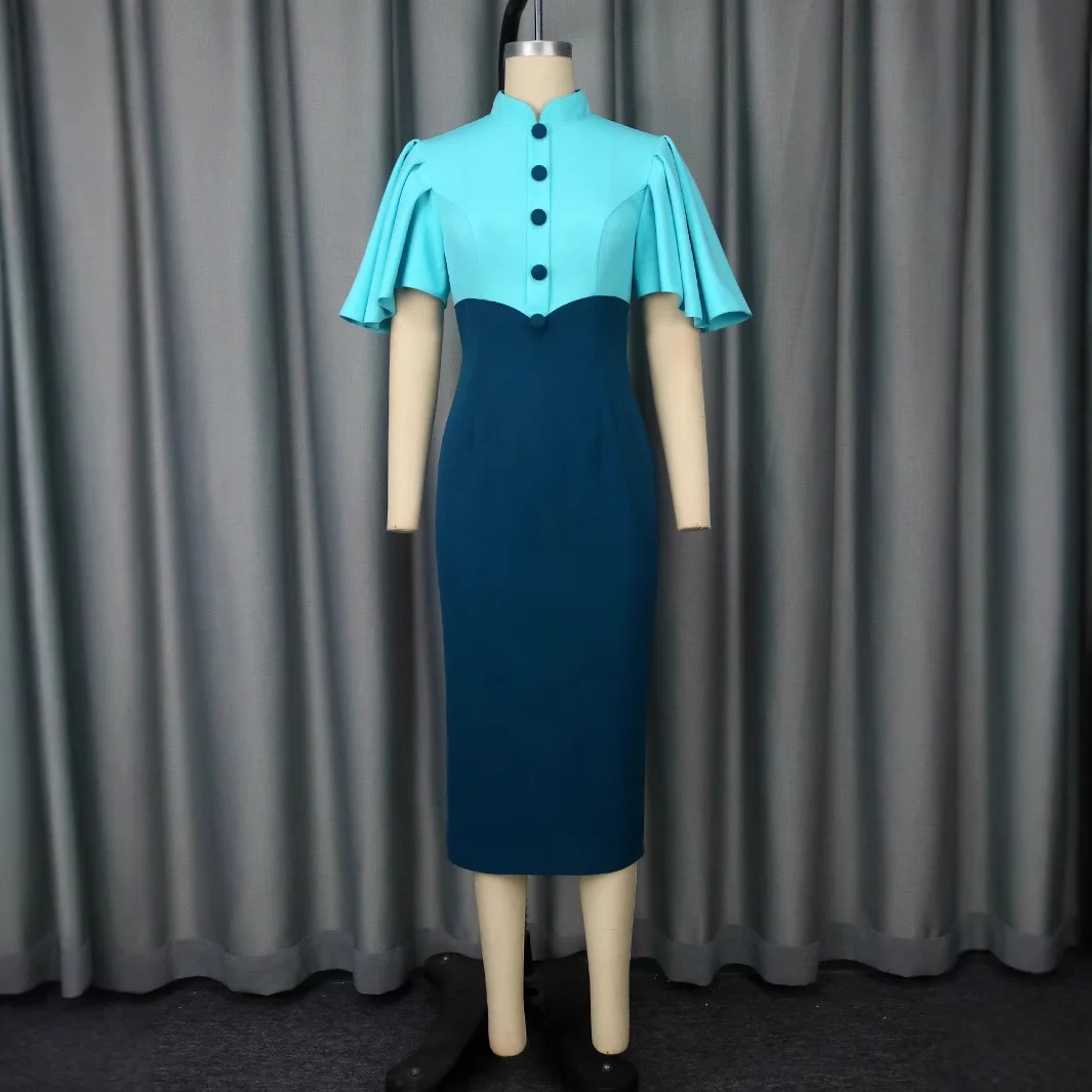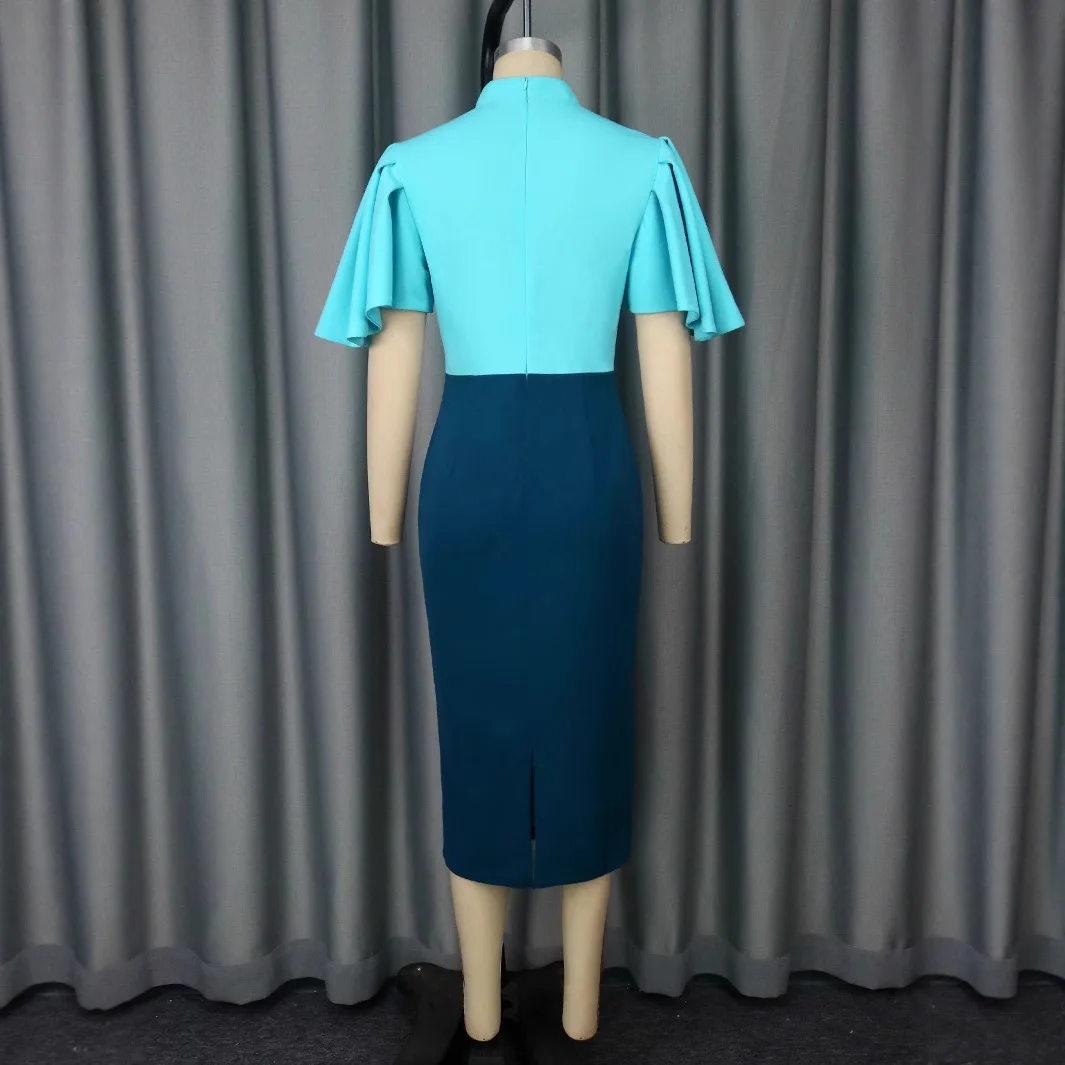 Sky Blue Women's Elegant Bodycon Midi Dress Plus Size Contrat Color Blocked Stand Collar Ruffled Sleeve for Summer