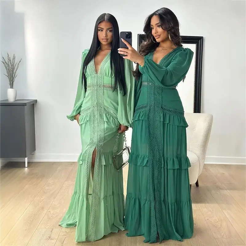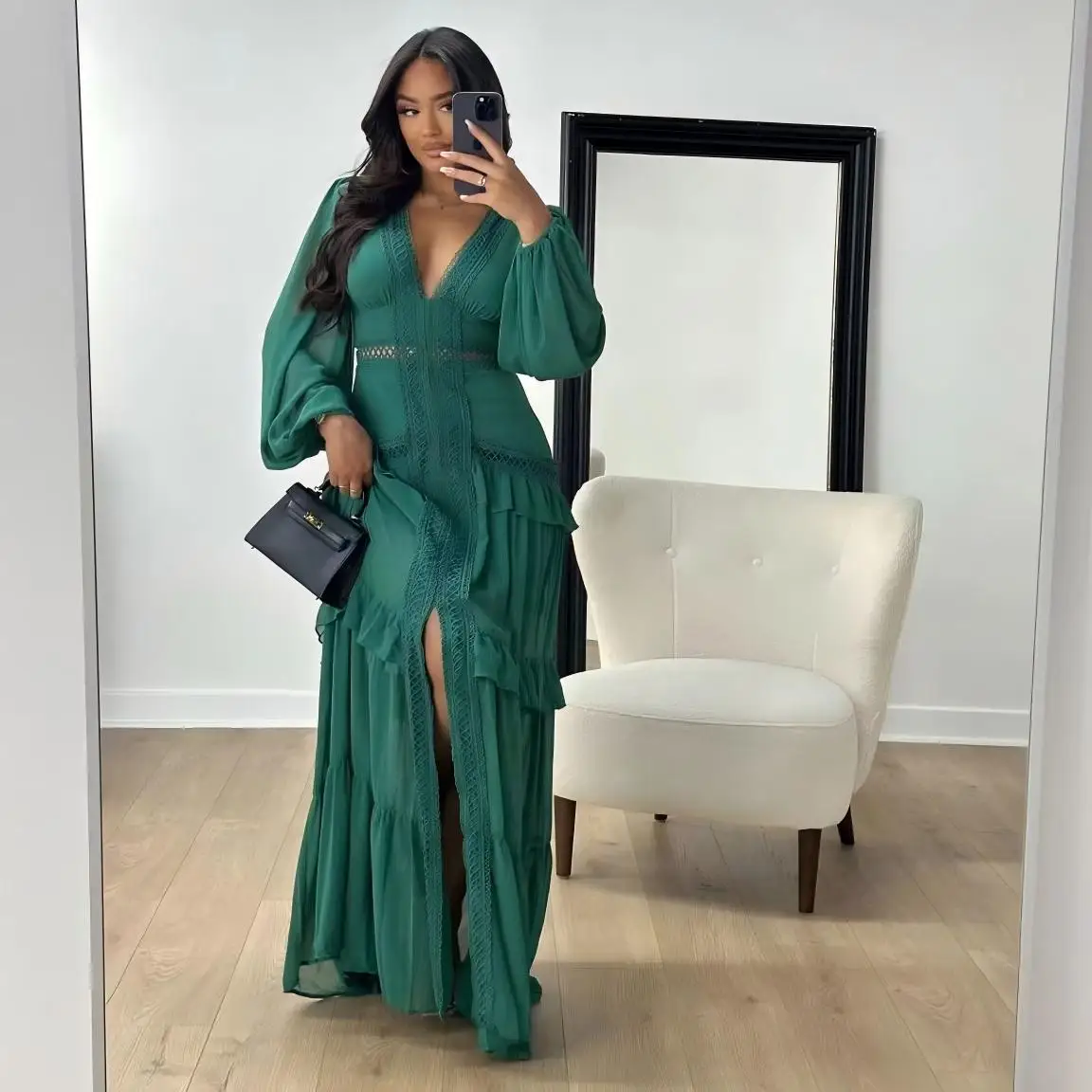 Elegant Long Sleeve V Neck Maxi Party Women's Chiffon Options Solid Color Women's Dress Long Sleeve V Neck