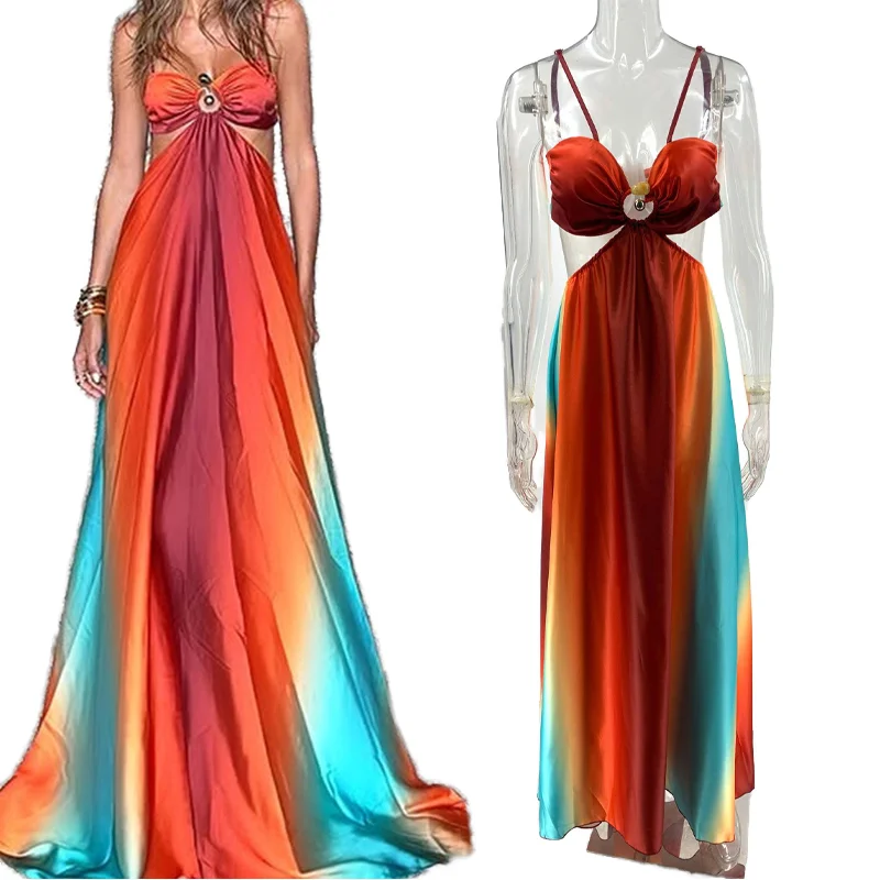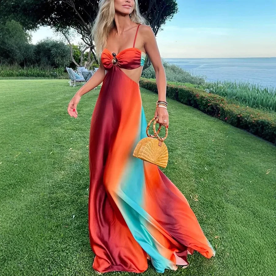 Women's Sleeveless Spaghetti Strap Elegant Evening Dress Gradient Printed Long Party Dress Empire Sexy Fashionable Summer Casual