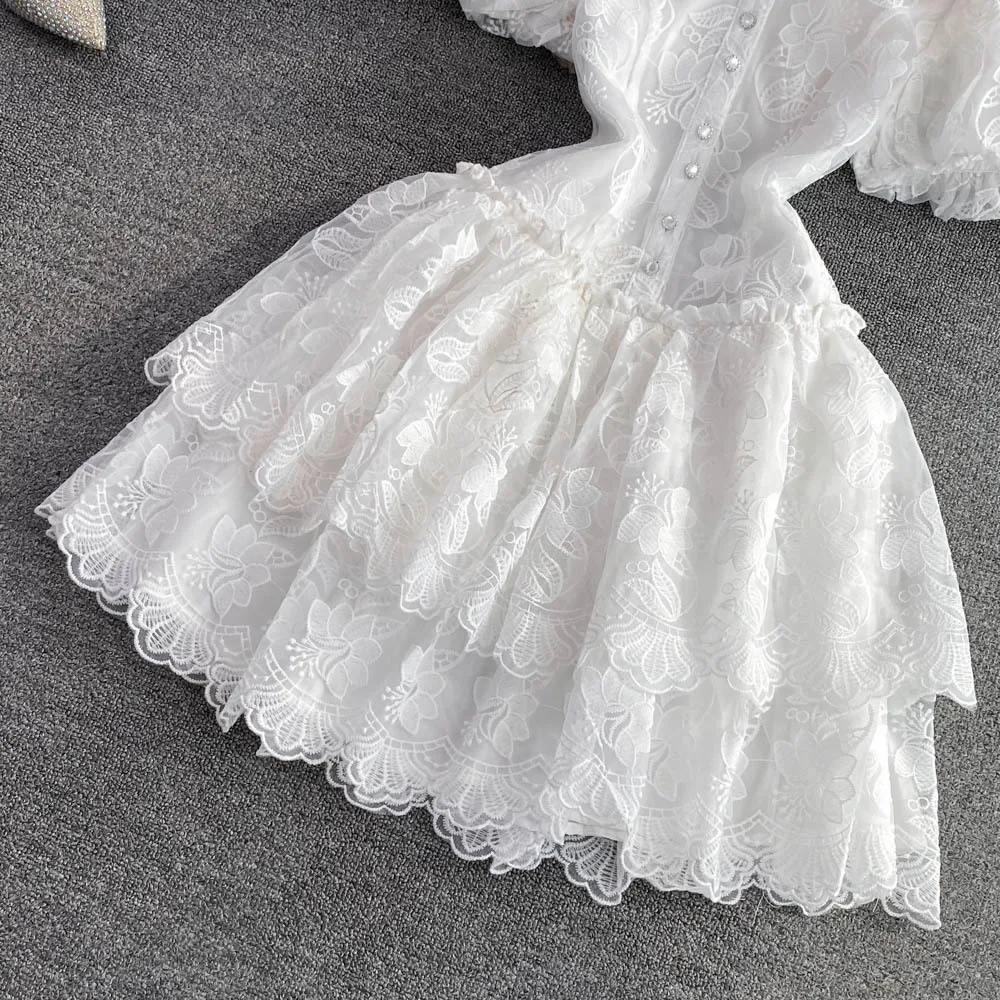Wholesale Summer Retro A-Line Cake Dress White Embroidered Bubble Sleeve with Solid Pattern Lace Fabric for Dress